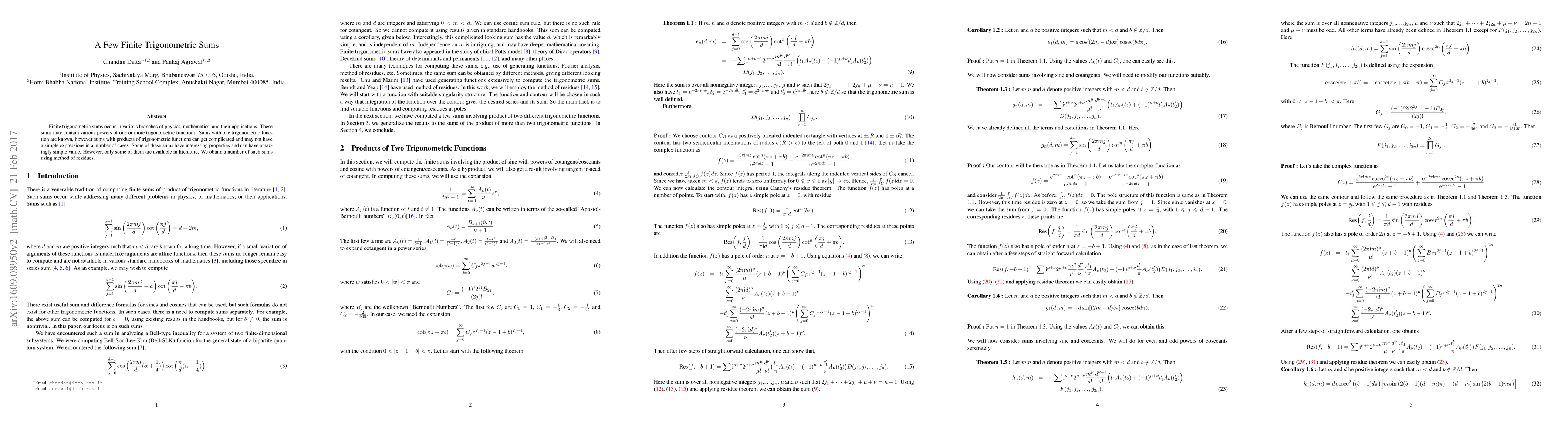 This paper explores finite trigonometric sums, particularly those involving products of trigonometric functions, and demonstrates their evaluation using the method of residues. It highlights sums with unexpectedly simple values and contributes new results to the existing literature.