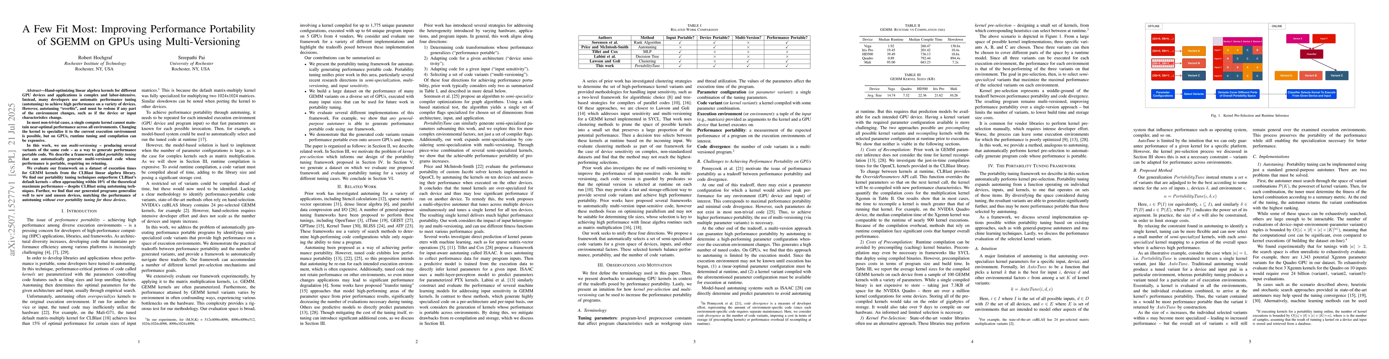 Hand-optimizing linear algebra kernels for different GPU devices and applications is complex and labor-intensive. Instead, many developers use automatic performance tuning (autotuning) to achieve high performance on a variety of devices. However, autotuning "overfits", and must be redone if any part of the environment changes, such as if the device or input characteristics change. In most non-trivial cases, a single compute kernel cannot maintain near-optimal performance across all environments. Changing the kernel to specialize it to the current execution environment is possible, but on GPUs, runtime tuning and compilation can be expensive. In this work, we use multi-versioning -- producing several variants of the same code -- as a way to generate performance portable code. We describe a framework called portability tuning that can automatically generate multi-versioned code whose performance is portable, requiring no retuning. We evaluate our framework on a dataset of execution times for GEMM kernels from the CLBlast linear algebra library. We find our portability tuning techniques outperform CLBlast's default kernels -- often approaching within 10% of the theoretical maximum performance -- despite CLBlast using autotuning techniques. Further, we find that our generated programs generalize well to new and unseen devices, matching the performance of autotuning without ever portability tuning for those devices.