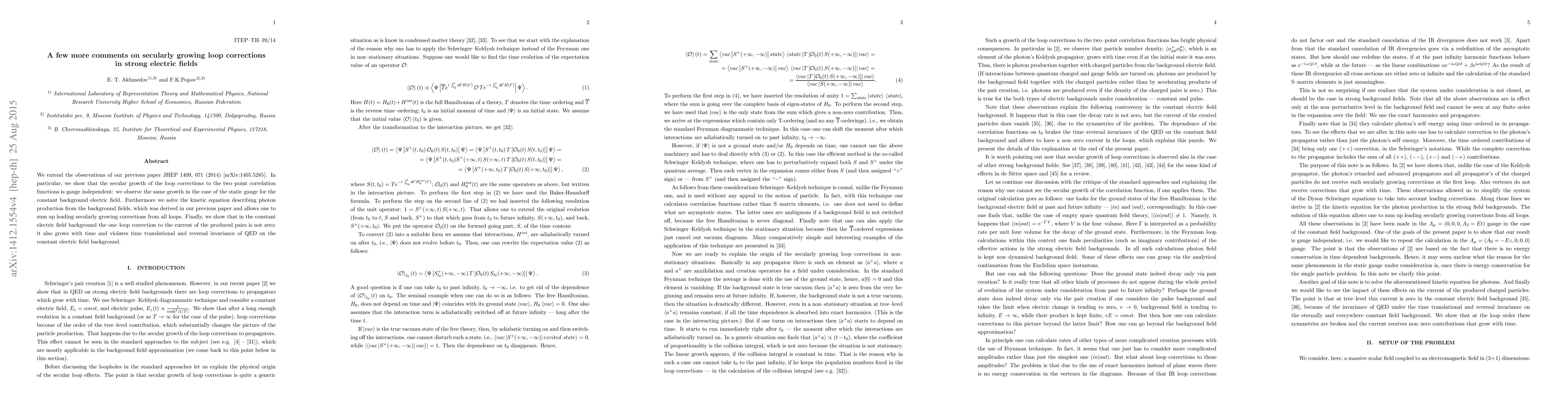 This paper extends previous findings on secularly growing loop corrections in strong electric fields, demonstrating gauge independence of their growth. It also solves the kinetic equation for photon production, revealing that one-loop corrections to the current of produced pairs grow over time, violating time translational and reversal invariance in QED under constant electric fields.