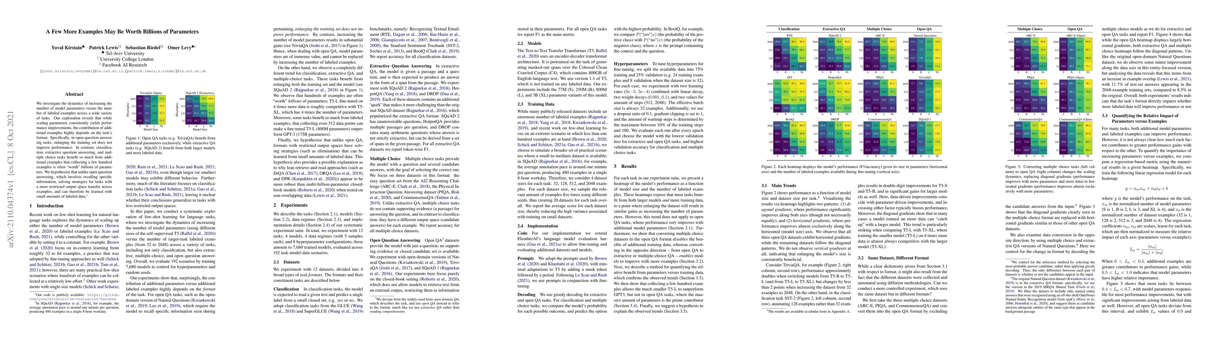 We investigate the dynamics of increasing the number of model parameters versus the number of labeled examples across a wide variety of tasks. Our exploration reveals that while scaling parameters consistently yields performance improvements, the contribution of additional examples highly depends on the task's format. Specifically, in open question answering tasks, enlarging the training set does not improve performance. In contrast, classification, extractive question answering, and multiple choice tasks benefit so much from additional examples that collecting a few hundred examples is often "worth" billions of parameters. We hypothesize that unlike open question answering, which involves recalling specific information, solving strategies for tasks with a more restricted output space transfer across examples, and can therefore be learned with small amounts of labeled data.
