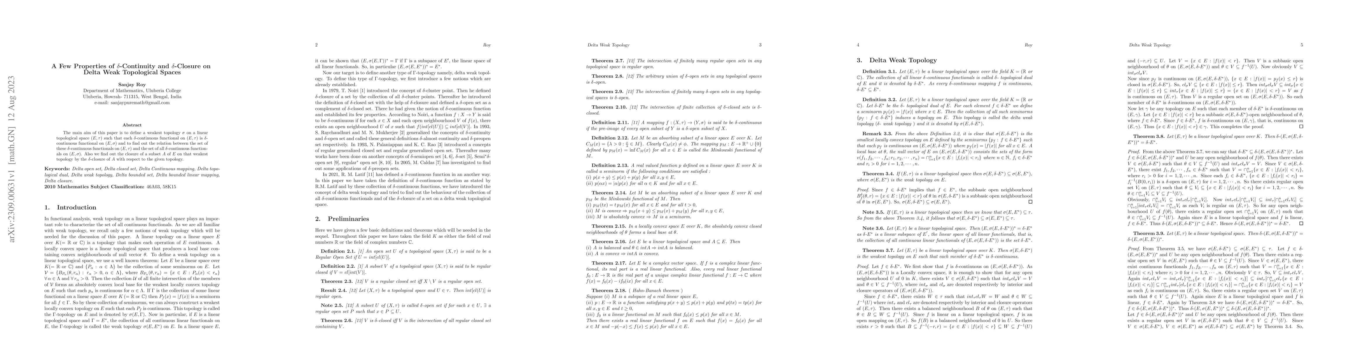 This paper defines a weakest topology $\sigma$ on a linear topological space $(E, \tau)$ where $\delta$-continuous functionals remain $\delta$-continuous, and explores the relationship between $\delta$-continuous functionals on $(E, \tau)$ and $(E, \sigma)$. It also investigates the $\delta$-closure of subsets in this new topology.