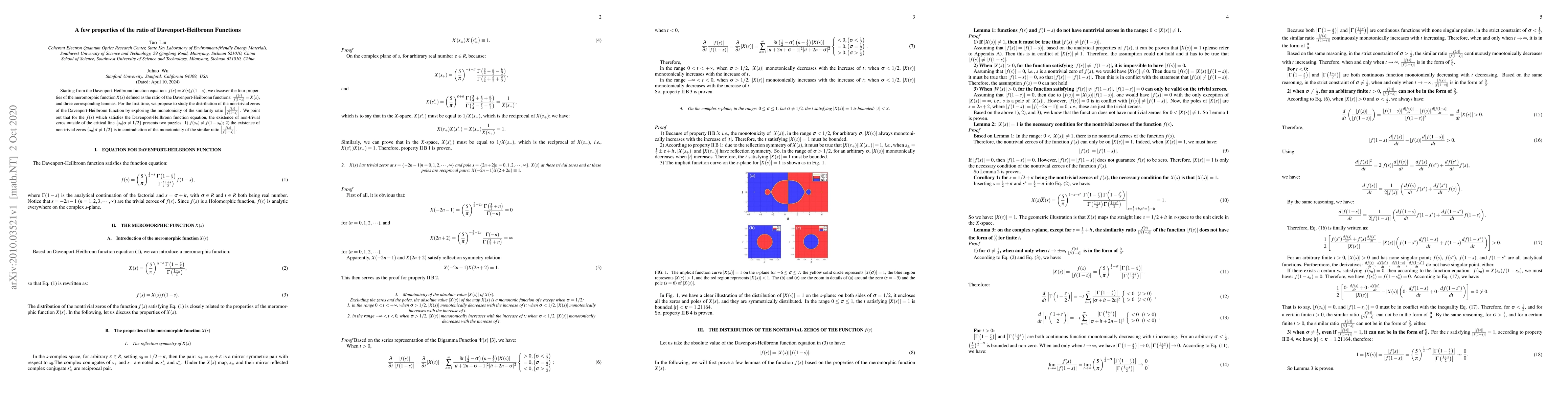 Starting from the Davenport-Heilbronn function equation: $f(s) = X(s) f(1-s)$, we discover the four properties of the meromorphic function $X(s)$ defined as the ratio of the Davenport-Heilbronn functions: $\frac{f(s)}{f(1-s)} = X(s)$, and three corresponding lemmas. For the first time, we propose to study the distribution of the non-trivial zeros of the Davenport-Heilbronn function by exploring the monotonicity of the similarity ratio $\left| \frac{f(s)}{f(1-s)} \right|$. We point out that for the $f(s)$ which satisfies the Davenport-Heilbronn function equation, the existence of non-trivial zeros outside of the critical line $\{ s_n | \sigma \neq 1/2 \}$ presents two puzzles: 1) $f(s_n) \neq f(1 - s_n)$; 2) the existence of non-trivial zeros $\{ s_n | \sigma \neq 1/2 \}$ is in contradiction of the monotonicity of the similar ratio $\left| \frac{f(s)}{f(1-s)}\right|$.