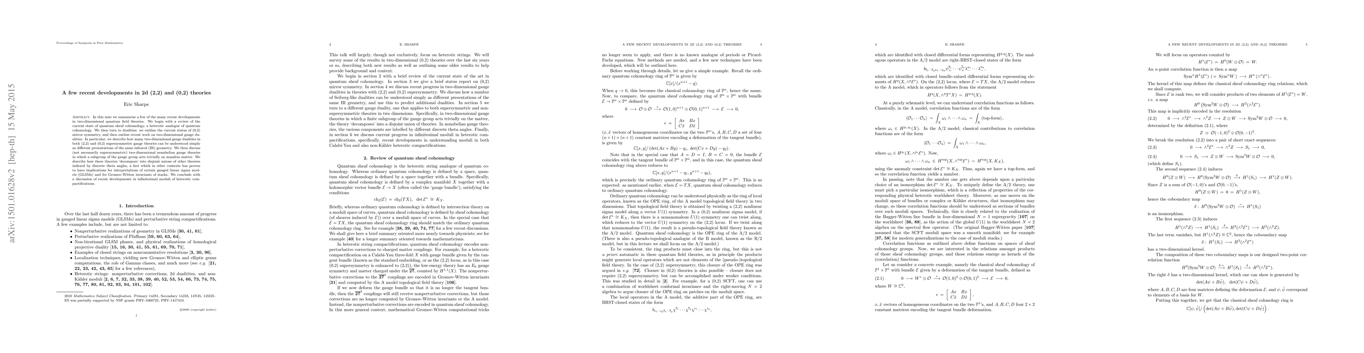 In this note we summarize a few of the many recent developments in two-dimensional quantum field theories. We begin with a review of the current state of quantum sheaf cohomology, a heterotic analogue of quantum cohomology. We then turn to dualities: we outline the current status of (0,2) mirror symmetry, and then outline recent work on two-dimensional gauge dualities. In particular, we describe how many two-dimensional gauge dualities in both (2,2) and (0,2) supersymmetric gauge theories can be understood simply as different presentations of the same infrared (IR) geometry. We then discuss (not necessarily supersymmetric) two-dimensional nonabelian gauge theories in which a subgroup of the gauge group acts trivially on massless matter. We describe how these theories 'decompose' into disjoint unions of other theories indexed by discrete theta angles, a fact which in other contexts has proven to have implications for interpretations of certain gauged linear sigma models (GLSMs) and for Gromov-Witten invariants of stacks. We conclude with a discussion of recent developments in infinitesimal moduli of heterotic compactifications.