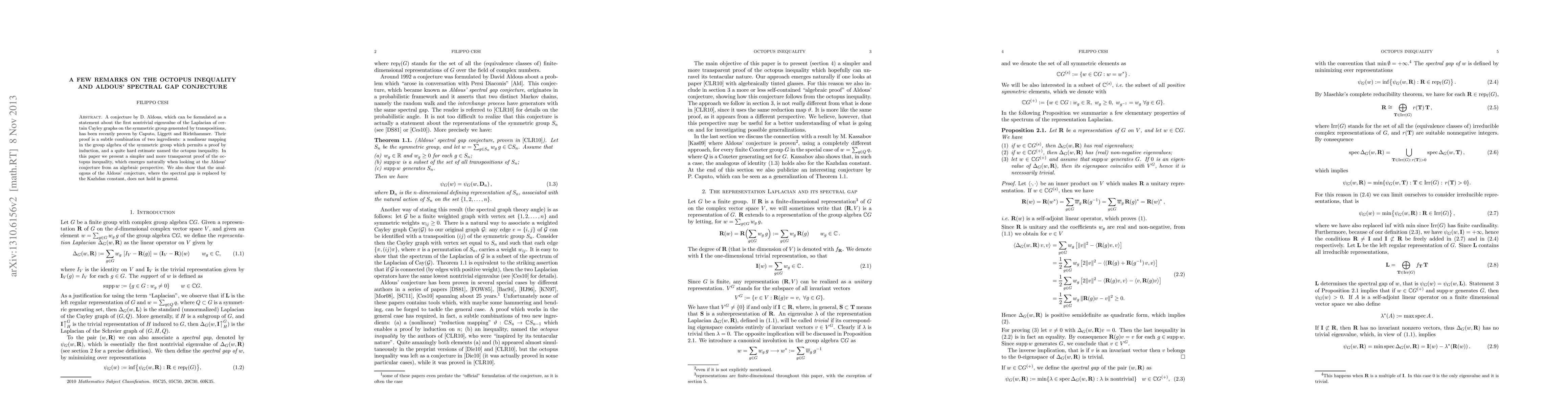 This paper provides a clearer proof of the octopus inequality, crucial for Aldous' conjecture on the first eigenvalue of Laplacians on symmetric group Cayley graphs, and shows that an analogous conjecture involving the Kazhdan constant instead of the spectral gap does not generally hold.