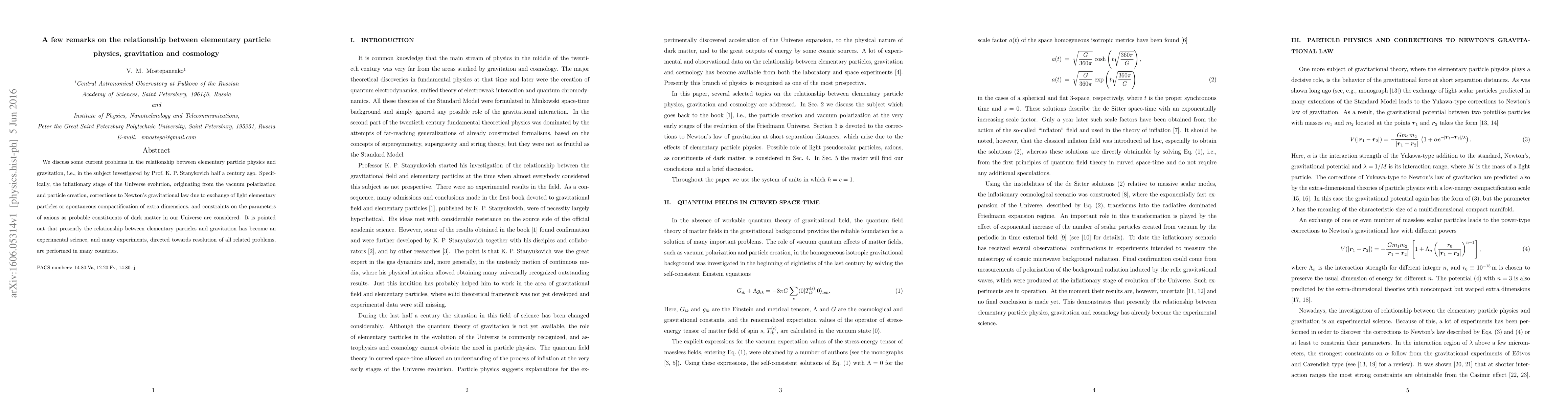 We discuss some current problems in the relationship between elementary particle physics and gravitation, i.e., in the subject investigated by Prof.~K.~P.~Staniukovich half a century ago. Specifically, the inflationary stage of the Universe evolution, originating from the vacuum polarization and particle creation, corrections to Newton's gravitational law due to exchange of light elementary particles or spontaneous compactification of extra dimensions, and constraints on the parameters of axions as probable constituents of dark matter in our Universe are considered. It is pointed out that presently the relationship between elementary particles and gravitation has become an experimental science, and many experiments, directed towards resolution of all related problems, are performed in many countries.