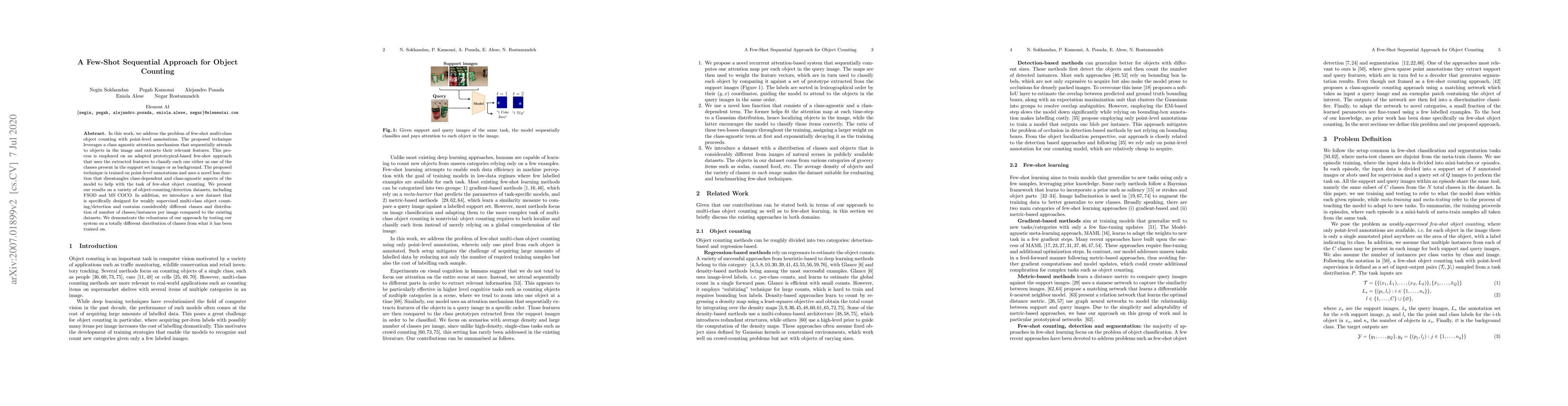 This paper proposes a few-shot sequential approach for multi-class object counting using point-level annotations, leveraging a class-agnostic attention mechanism and a novel loss function. The method is tested on various datasets, including a newly introduced dataset, demonstrating its robustness across different class distributions.