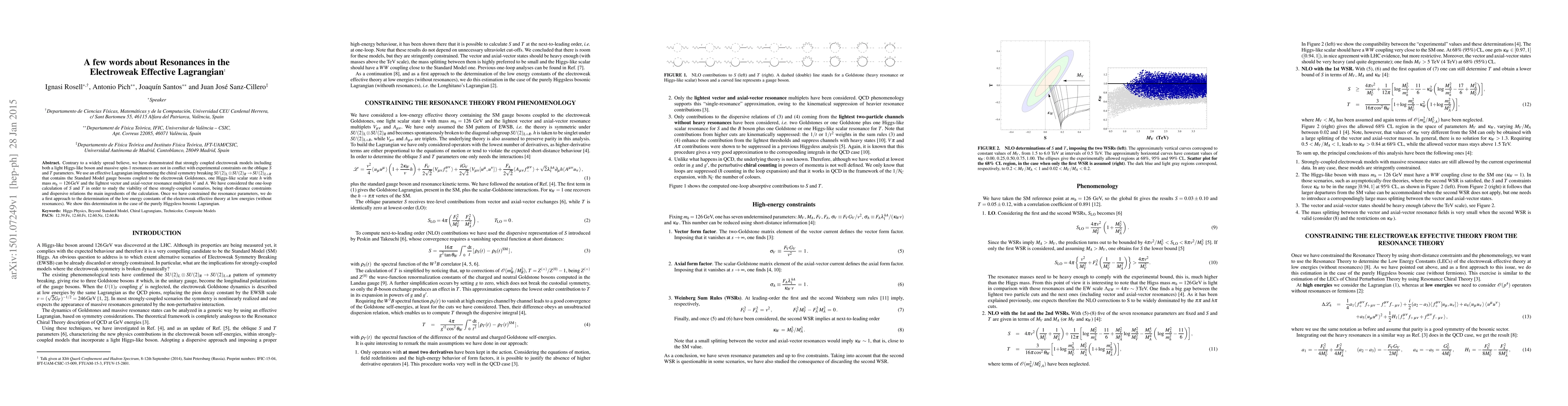 Contrary to a widely spread believe, we have demonstrated that strongly coupled electroweak models including both a light Higgs-like boson and massive spin-1 resonances are not in conflict with experimental constraints on the oblique S and T parameters. We use an effective Lagrangian implementing the chiral symmetry breaking SU(2)_L x SU(2)_R -> SU(2)_{L+R} that contains the Standard Model gauge bosons coupled to the electroweak Goldstones, one Higgs-like scalar state h with mass m_h=126 GeV and the lightest vector and axial-vector resonance multiplets V and A. We have considered the one-loop calculation of S and T in order to study the viability of these strongly-coupled scenarios, being short-distance constraints and dispersive relations the main ingredients of the calculation. Once we have constrained the resonance parameters, we do a first approach to the determination of the low energy constants of the electroweak effective theory at low energies (without resonances). We show this determination in the case of the purely Higgsless bosonic Lagrangian.