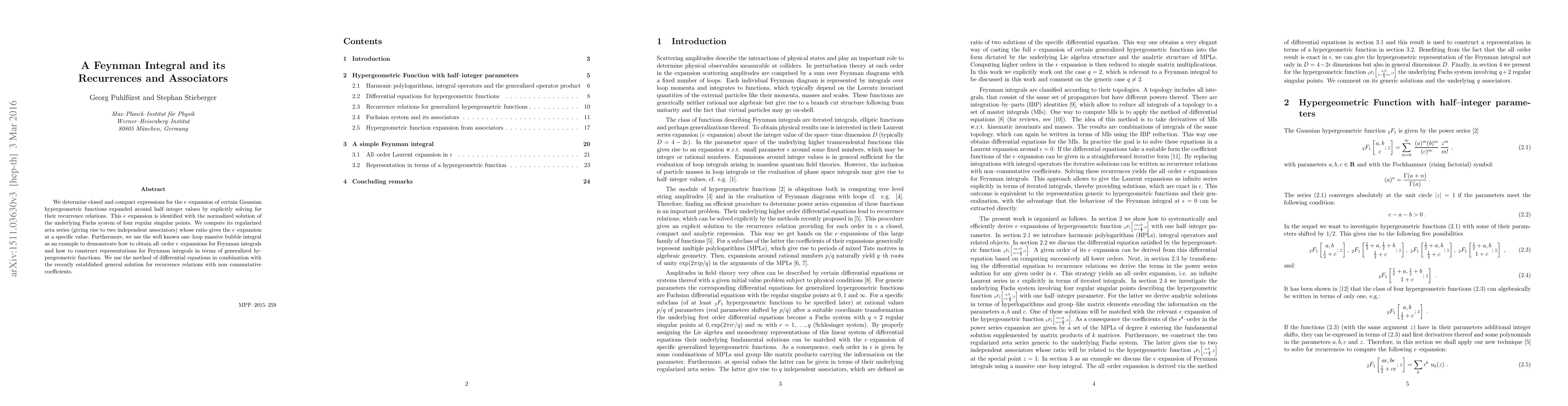 We determine closed and compact expressions for the epsilon-expansion of certain Gaussian hypergeometric functions expanded around half-integer values by explicitly solving for their recurrence relations. This epsilon-expansion is identified with the normalized solution of the underlying Fuchs system of four regular singular points. We compute its regularized zeta series (giving rise to two independent associators) whose ratio gives the epsilon-expansion at a specific value. Furthermore, we use the well known one-loop massive bubble integral as an example to demonstrate how to obtain all-order epsilon-expansions for Feynman integrals and how to construct representations for Feynman integrals in terms of generalized hypergeometric functions. We use the method of differential equations in combination with the recently established general solution for recurrence relations with non-commutative coefficients.