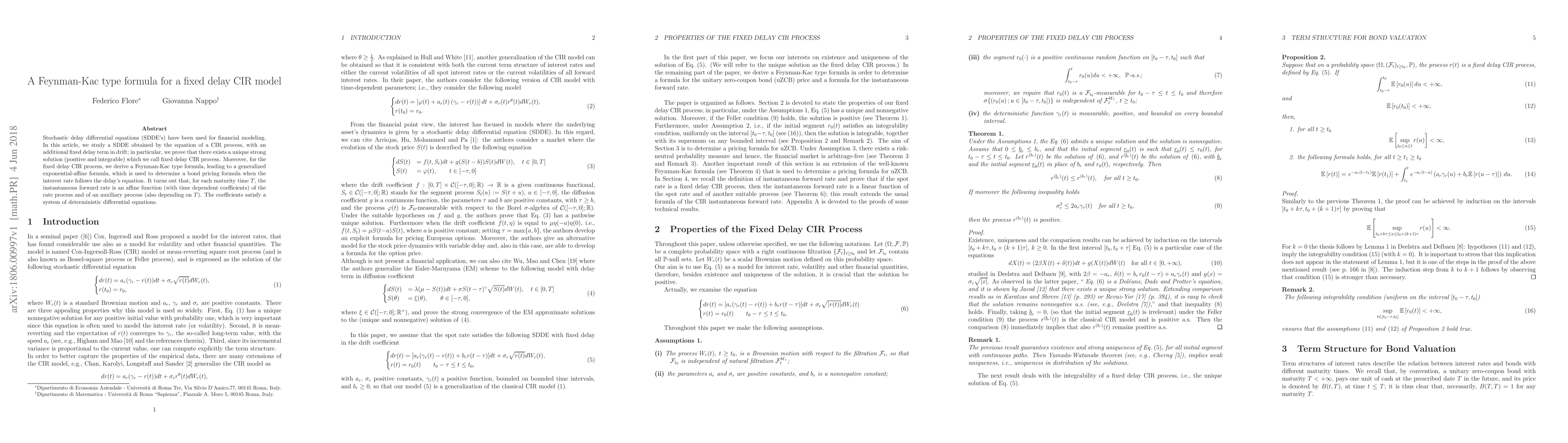 The paper studies a stochastic delay differential equation (SDDE) derived from a CIR process with an additional fixed delay term in the drift, proving the existence of a unique strong solution termed the fixed delay CIR process.