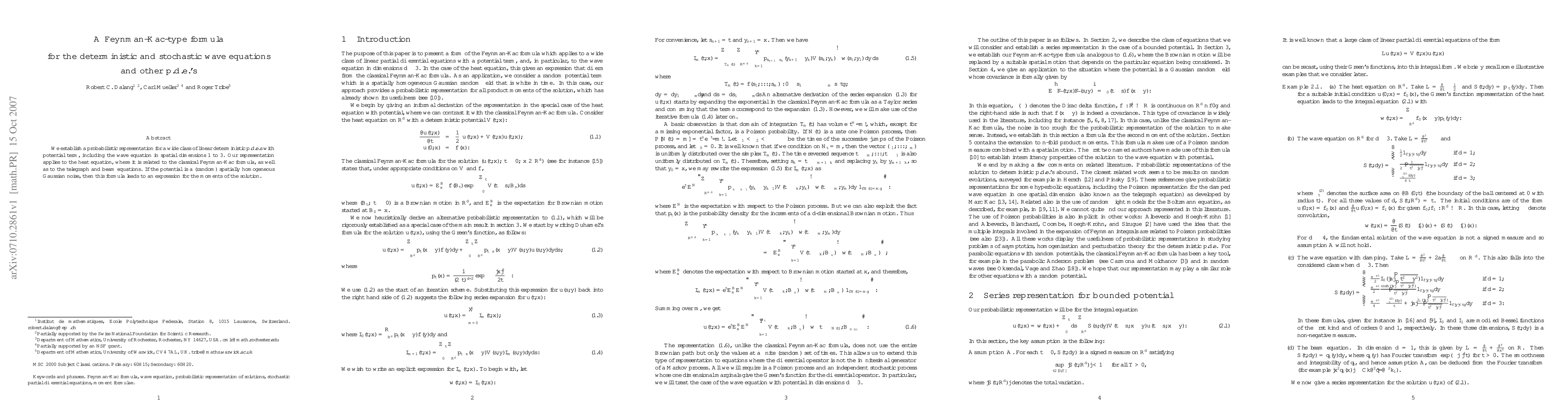 Researchers developed a probabilistic formula to solve deterministic partial differential equations with potential terms, including the wave equation in 1-3 dimensions, and showed it applies to related equations like the heat equation.