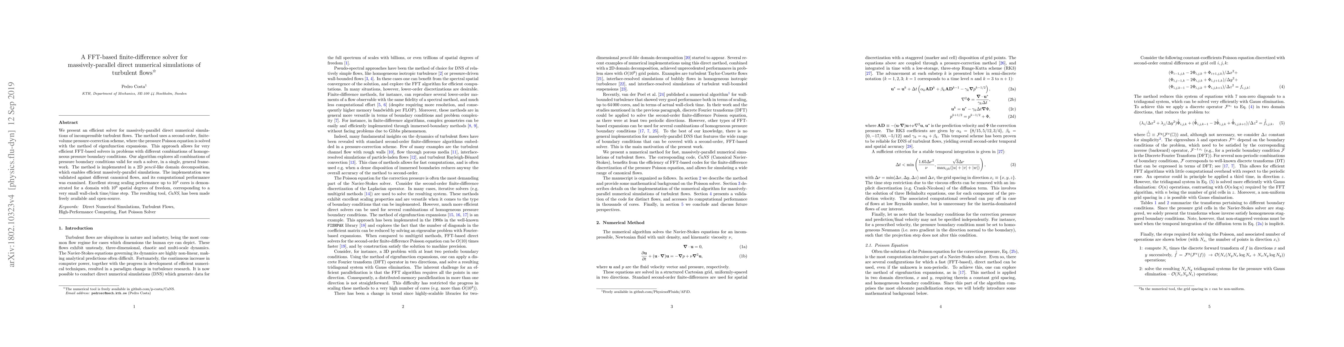 This paper introduces a highly efficient FFT-based finite-difference solver for direct numerical simulations of turbulent flows, implemented in a scalable, parallel framework, demonstrating excellent performance up to 10,000 cores and providing an open-source tool called CaNS.