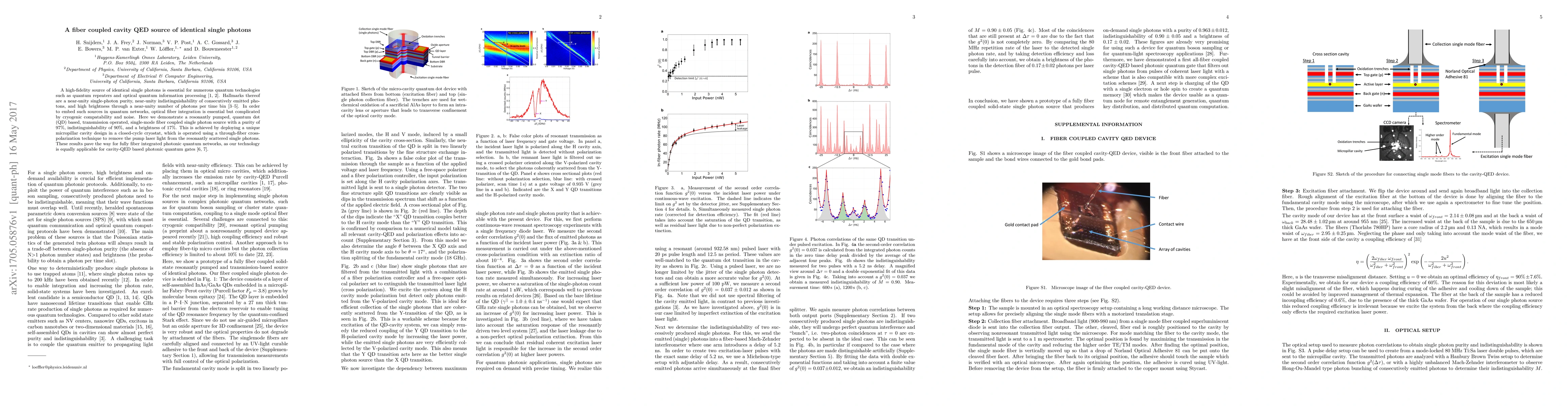 This paper presents a fiber-coupled cavity QED source utilizing a quantum dot in a micropillar cavity to generate identical single photons with high purity and indistinguishability, enabling potential integration into quantum networks. The demonstrated system achieves 97% purity and 90% indistinguishability through a closed-cycle cryostat and cross-polarization technique.