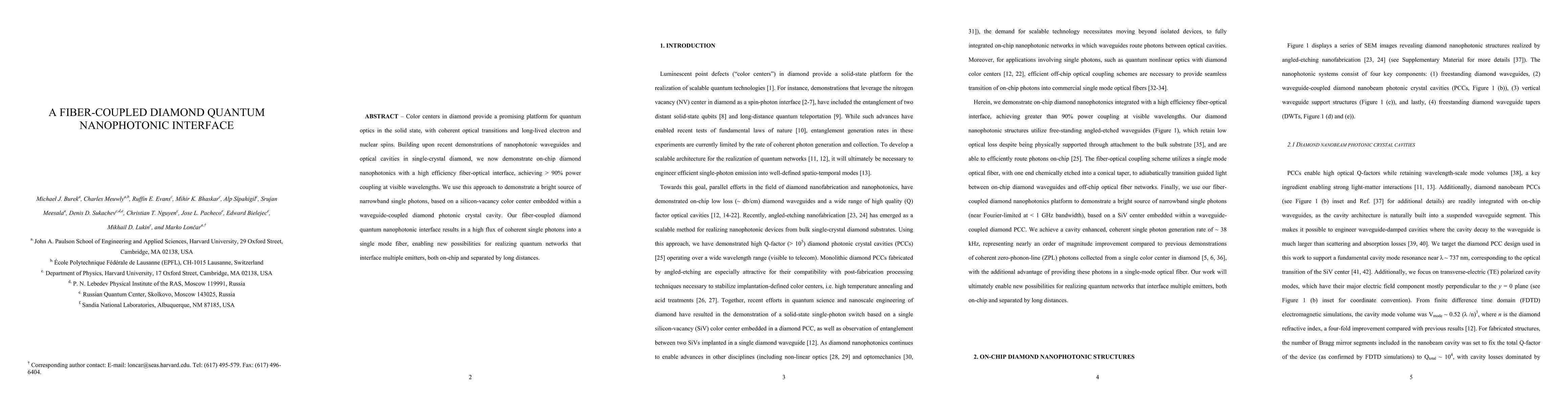 Color centers in diamond provide a promising platform for quantum optics in the solid state, with coherent optical transitions and long-lived electron and nuclear spins. Building upon recent demonstrations of nanophotonic waveguides and optical cavities in single-crystal diamond, we now demonstrate on-chip diamond nanophotonics with a high efficiency fiber-optical interface, achieving > 90% power coupling at visible wavelengths. We use this approach to demonstrate a bright source of narrowband single photons, based on a silicon-vacancy color center embedded within a waveguide-coupled diamond photonic crystal cavity. Our fiber-coupled diamond quantum nanophotonic interface results in a high flux of coherent single photons into a single mode fiber, enabling new possibilities for realizing quantum networks that interface multiple emitters, both on-chip and separated by long distances.