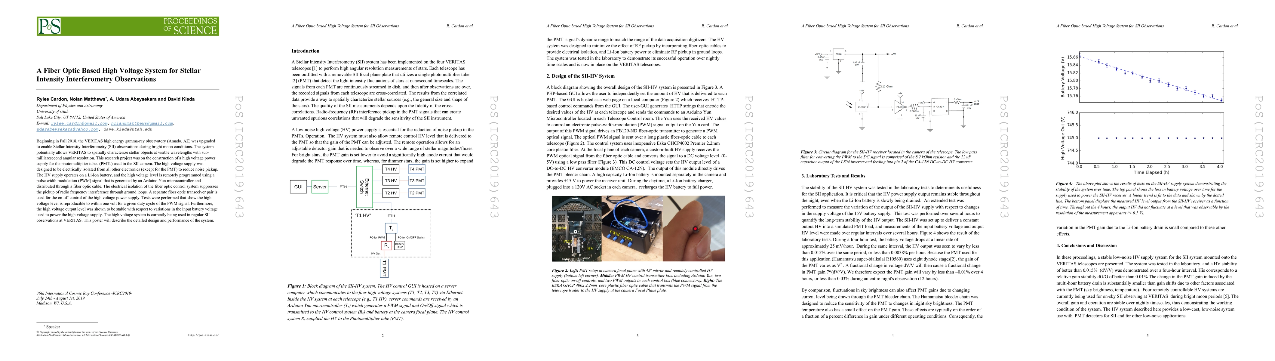 Beginning in Fall 2018, the VERITAS high energy gamma-ray observatory (Amado, AZ) was upgraded to enable Stellar Intensity Interferometry (SII) observations during bright moon conditions. The system potentially allows VERITAS to spatially characterize stellar objects at visible wavelengths with sub-milliarcsecond angular resolution. This research project was on the construction of a high voltage power supply for the photomultiplier tubes (PMTs) used in the SII camera. The high voltage supply was designed to be electrically isolated from all other electronics (except for the PMT) to reduce noise pickup. The HV supply operates on a Li-Ion battery, and the high voltage level is remotely programmed using a pulse width modulation (PWM) signal that is generated by an Arduino Yun microcontroller and distributed through a fiber optic cable. The electrical isolation of the fiber optic control system suppresses the pickup of radio frequency interference through ground loops. A separate fiber optic transceiver pair is used for the on-off control of the high voltage power supply. Tests were performed that show the high voltage level is reproducible to within one volt for a given duty cycle of the PWM signal. Furthermore, the high voltage output level was shown to be stable with respect to variations in the input battery voltage used to power the high voltage supply. The high voltage system is currently being used in regular SII observations at VERITAS. This poster will describe the detailed design and performance of the system.