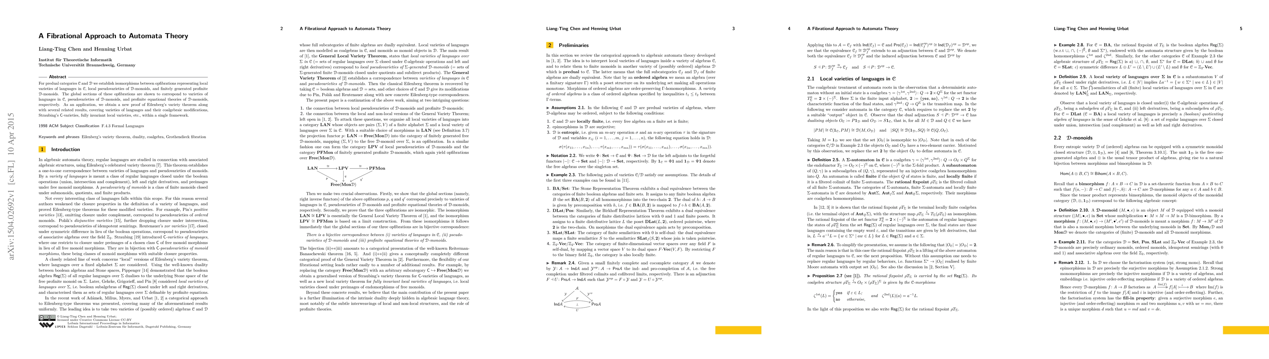 For predual categories C and D we establish isomorphisms between opfibrations representing local varieties of languages in C, local pseudovarieties of D-monoids, and finitely generated profinite D-monoids. The global sections of these opfibrations are shown to correspond to varieties of languages in C, pseudovarieties of D-monoids, and profinite equational theories of D-monoids, respectively. As an application, we obtain a new proof of Eilenberg's variety theorem along with several related results, covering varieties of languages and their coalgebraic modifications, Straubing's C-varieties, fully invariant local varieties, etc., within a single framework.