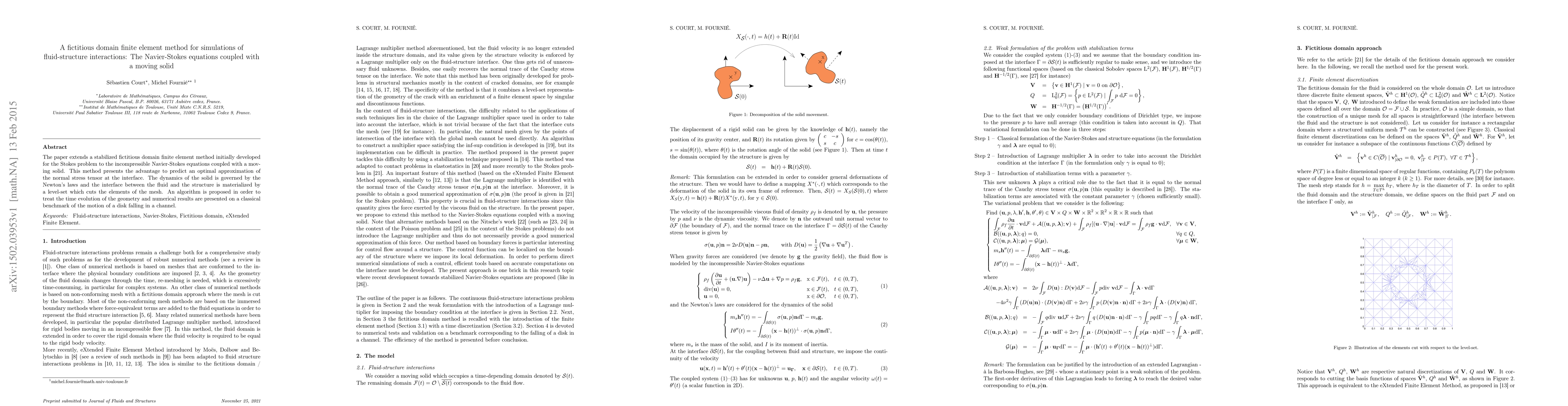 This paper develops a stabilized fictitious domain finite element method for simulating fluid-structure interactions, coupling the incompressible Navier-Stokes equations with a moving solid. The method optimally approximates the normal stress tensor at the fluid-structure interface and employs a level-set for evolving geometry, validated through a benchmark of a falling disk in a channel.