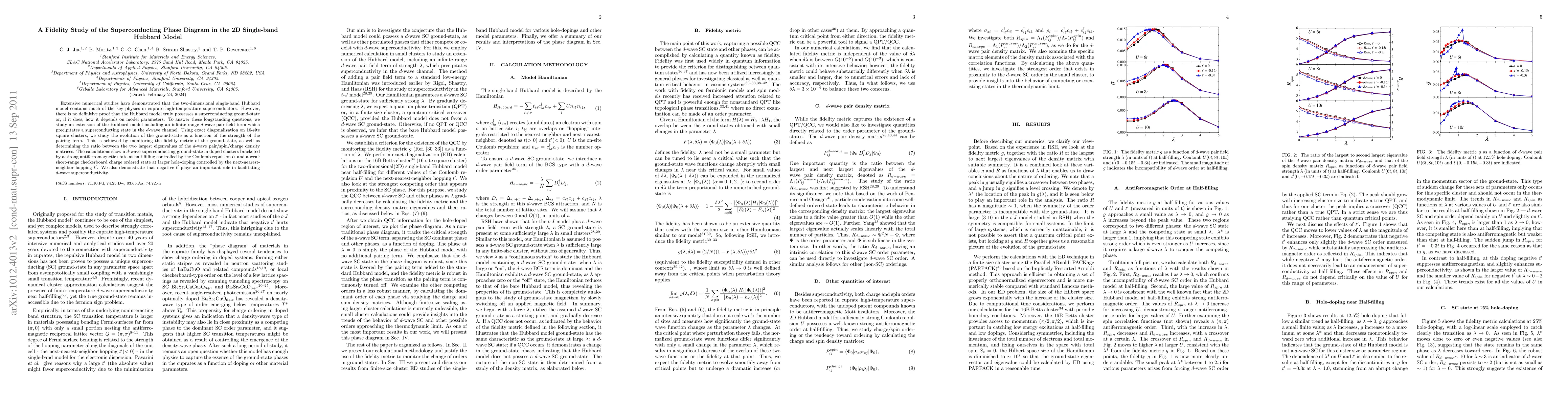Extensive numerical studies have demonstrated that the two-dimensional single-band Hubbard model contains much of the key physics in cuprate high-temperature superconductors. However, there is no definitive proof that the Hubbard model truly possesses a superconducting ground state or, if it does, of how it depends on model parameters. To answer these longstanding questions, we study an extension of the Hubbard model including an infinite-range d-wave pair field term, which precipitates a superconducting state in the d-wave channel. Using exact diagonalization on 16-site square clusters, we study the evolution of the ground state as a function of the strength of the pairing term. This is achieved by monitoring the fidelity metric of the ground state, as well as determining the ratio between the two largest eigenvalues of the d-wave pair/spin/charge-density matrices. The calculations show a d-wave superconducting ground state in doped clusters bracketed by a strong antiferromagnetic state at half filling controlled by the Coulomb repulsion U and a weak short-range checkerboard charge ordered state at larger hole doping controlled by the next-nearest-neighbor hopping t'. We also demonstrate that negative t' plays an important role in facilitating d-wave superconductivity.