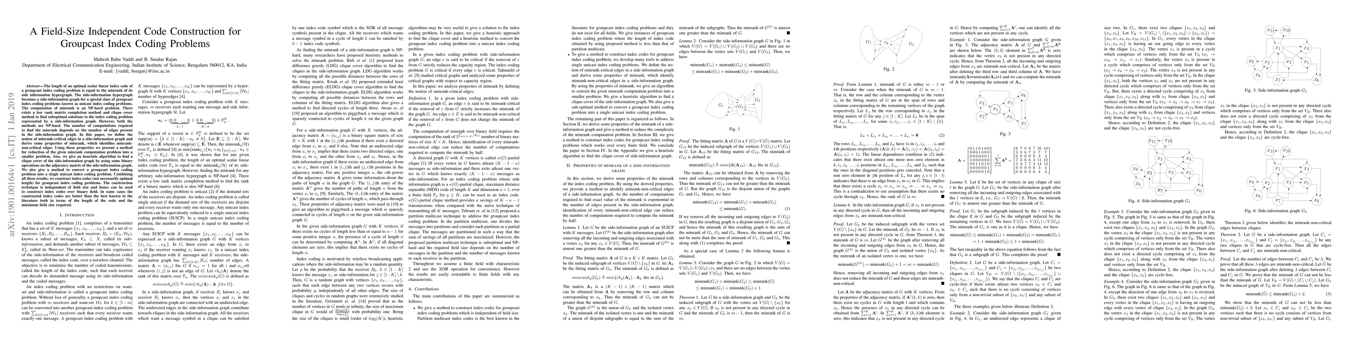 The length of an optimal scalar linear index code of a groupcast index coding problem is equal to the minrank of its side information hypergraph. The side-information hypergraph becomes a side-information graph for a special class of groupcast index coding problems known as unicast index coding problems. The computation of minrank is an NP-hard problem. There exists a low rank matrix completion method and clique cover method to find suboptimal solutions to the index coding problem represented by a side-information graph. However, both the methods are NP-hard. The number of computations required to find the minrank depends on the number of edges present in the side-information graph. In this paper, we define the notion of minrank-critical edges in a side-information graph and derive some properties of minrank, which identifies minrank-non-critical edges. Using these properties we present a method for reduction of the given minrank computation problem into a smaller problem. Also, we give an heuristic algorithm to find a clique cover of the side-information graph by using some binary operations on the adjacency matrix of the side-information graph. We also give a method to convert a groupcast index coding problem into a single unicast index coding problem. Combining all these results, we construct index codes (not necessarily optimal length) for groupcast index coding problems. The construction technique is independent of field size and hence can be used to construct index codes over binary field. In some cases the constructed index codes are better than the best known in the literature both in terms of the length of the code and the minimum field size required.