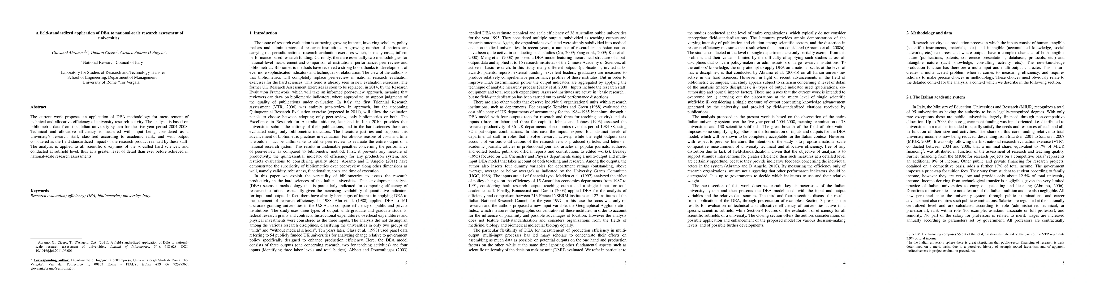 This paper applies Data Envelopment Analysis (DEA) to assess the technical and allocative efficiency of Italian university research activities from 2004-2008, using bibliometric data and considering research staff and field-standardized impact as inputs and outputs, respectively. The study provides detailed efficiency measurements across all hard science disciplines at subfield levels.