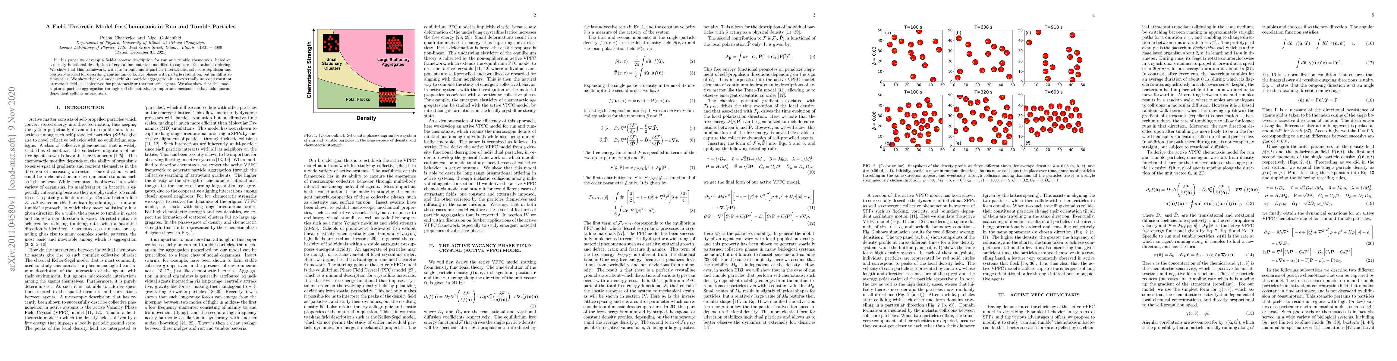 In this paper we develop a field-theoretic description for run and tumble chemotaxis, based on a density functional description of crystalline materials modified to capture orientational ordering. We show that this framework, with its in-built multi-particle interactions, soft-core repulsion and elasticity is ideal for describing continuum collective phases with particle resolution, but on diffusive timescales. We show that our model exhibits particle aggregation in an externally imposed constant attractant field, as is observed for phototactic or thermotactic agents. We also show that this model captures particle aggregation through self-chemotaxis, an important mechanism that aids quorum dependent cellular interactions.