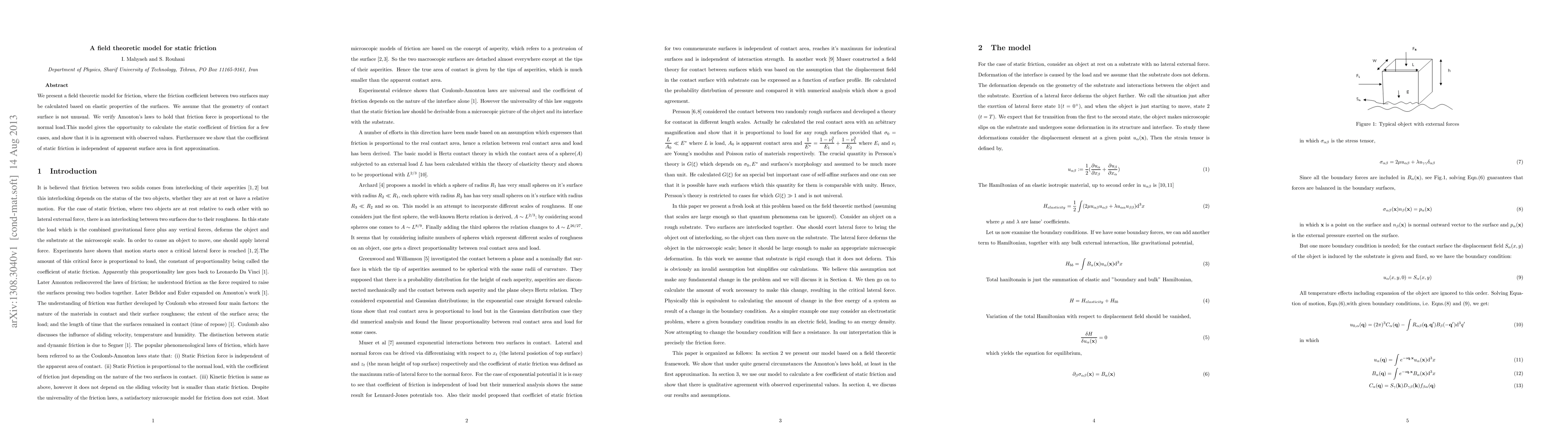 We present a field theoretic model for friction, where the friction coefficient between two surfaces may be calculated based on elastic properties of the surfaces. We assume that the geometry of contact surface is not unusual. We verify Amonton's laws to hold that friction force is proportional to the normal load.This model gives the opportunity to calculate the static coefficient of friction for a few cases, and show that it is in agreement with observed values. Furthermore we show that the coefficient of static friction is independent of apparent surface area in first approximation.
