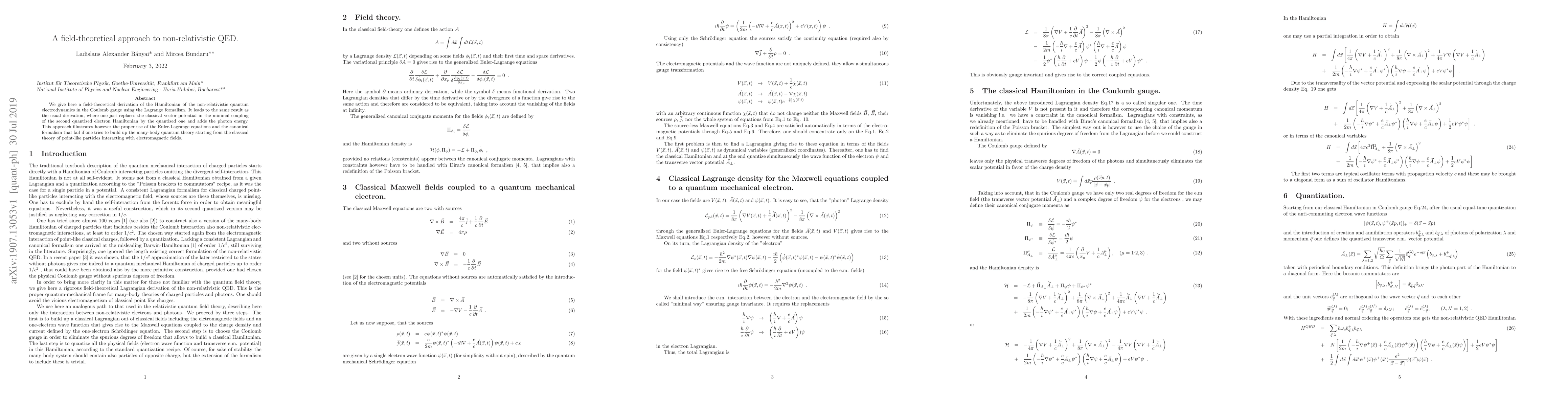 We give here a field-theoretical derivation of the Hamiltonian of the non-relativistic quantum electrodynamics in the Coulomb gauge using the Lagrange formalism. It leads to the same result as the usual derivation, where one just replaces the classical vector potential in the minimal coupling of the second quantized electron Hamiltonian by the quantized one and adds the photon energy. This approach illustrates however the proper use of the Euler-Lagrange equations and the canonical formalism that fail if one tries to build up the many-body quantum theory starting from the classical theory of point-like particles interacting with electromagnetic fields.
