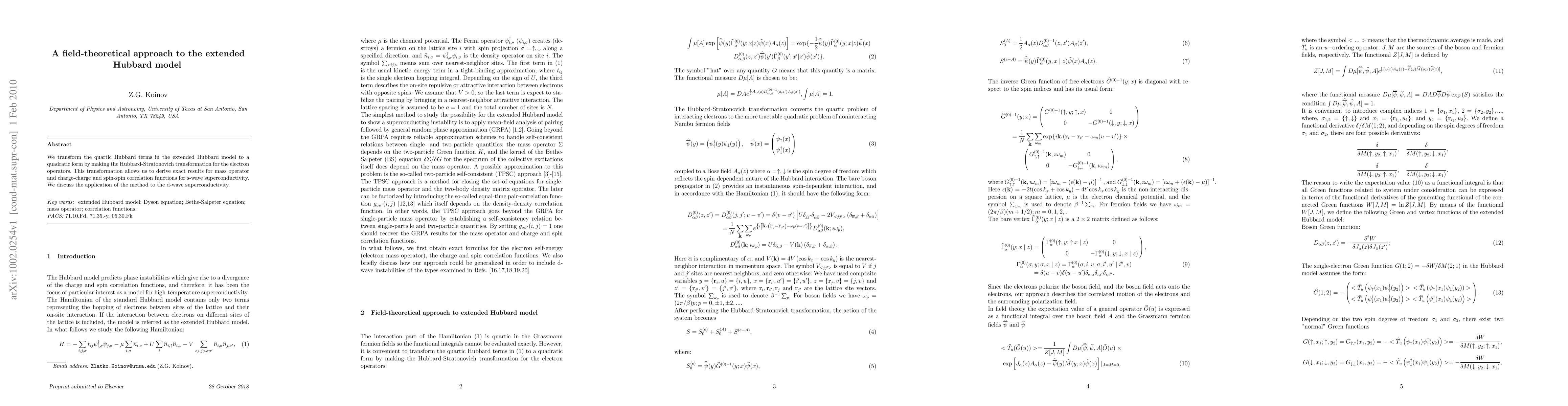 We transform the quartic Hubbard terms in the extended Hubbard model to a quadratic form by making the Hubbard-Stratonovich transformation for the electron operators. This transformation allows us to derive exact results for mass operator and charge-charge and spin-spin correlation functions for s-wave superconductivity. We discuss the application of the method to the d-wave superconductivity.