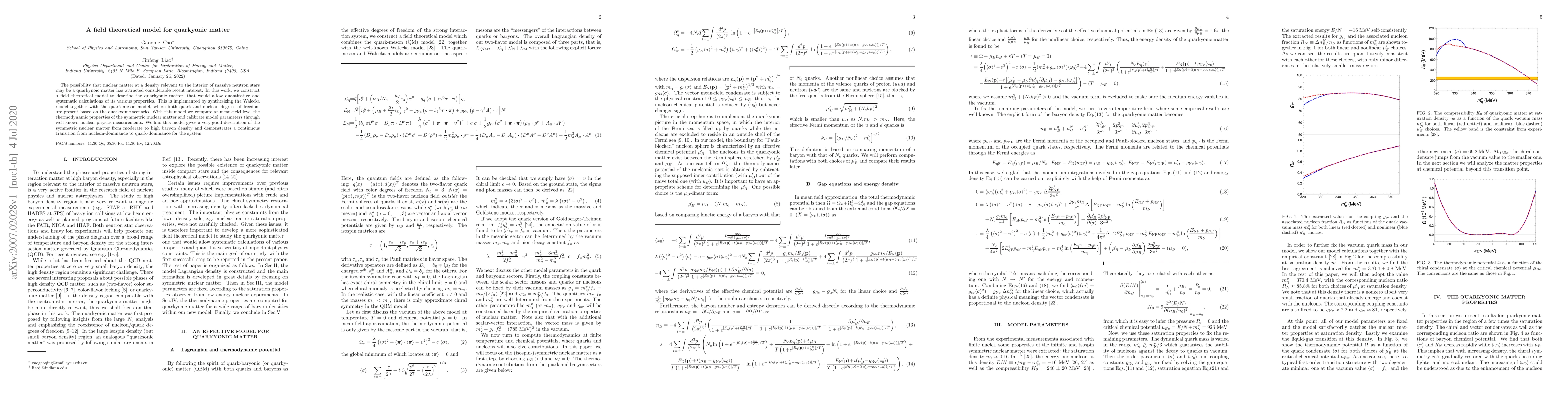 The possibility that nuclear matter at a density relevant to the interior of massive neutron stars may be a quarkynoic matter has attracted considerable recent interest. In this work, we construct a field theoretical model to describe the quarkyonic matter, that would allow quantitative and systematic calculations of its various properties. This is implemented by synthesizing the Walecka model together with the quark-meson model, where both quark and nucleon degrees of freedom are present based on the quarkyonic scenario. With this model we compute at mean-field level the thermodynamic properties of the symmetric nuclear matter and calibrate model parameters through well-known nuclear physics measurements. We find this model gives a very good description of the symmetric nuclear matter from moderate to high baryon density and demonstrates a continuous transition from nucleon-dominance to quark-dominance for the system.