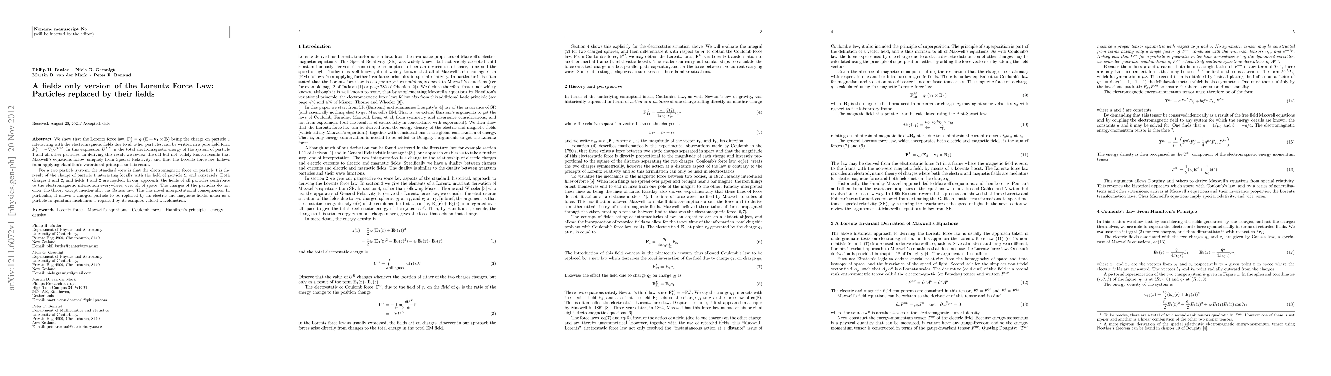We show that the Lorentz force law, F^L_1=q_1(E+v_1xB) being the charge on particle 1 interacting with the electromagnetic fields due to all other particles, can be written in a pure field form F^L_1=-\nabla_1 U^{EM}. In this expression U^{EM} is the total electromagnetic energy of the system of particle 1 and all other particles. In deriving this result we review the old but not widely known results that Maxwell's equations follow uniquely from Special Relativity, and that the Lorentz force law follows from applying Hamilton's variational principle to this result. For a two particle system, the standard view is that the electromagnetic force on particle 1 is the result of the charge of particle 1 interacting locally with the field of particle 2, and conversely. Both charges 1 and 2, and fields 1 and 2 are needed. In our approach, the fields of all particles contribute to the electromagnetic interaction everywhere, over all of space. The charges of the particles do not enter the theory except incidentally, via Gauss's law. This has novel interpretational consequences. In particular, it allows a charged particle to be replaced by its electric and magnetic fields, much as a particle in quantum mechanics is replaced by its complex valued wavefunction.