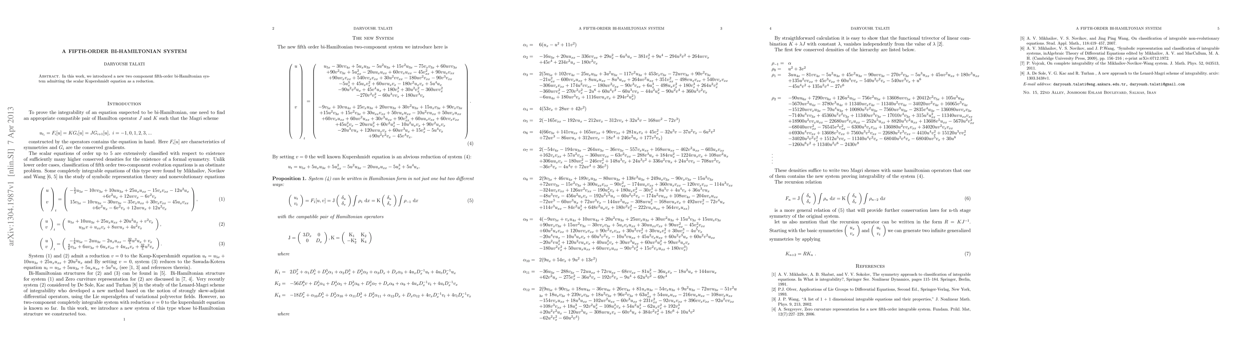 Summary: This paper presents a novel two-component fifth-order bi-Hamiltonian system that allows for the scalar Kupershmidt equation as a reduction, expanding the understanding of higher-order dynamical systems.
