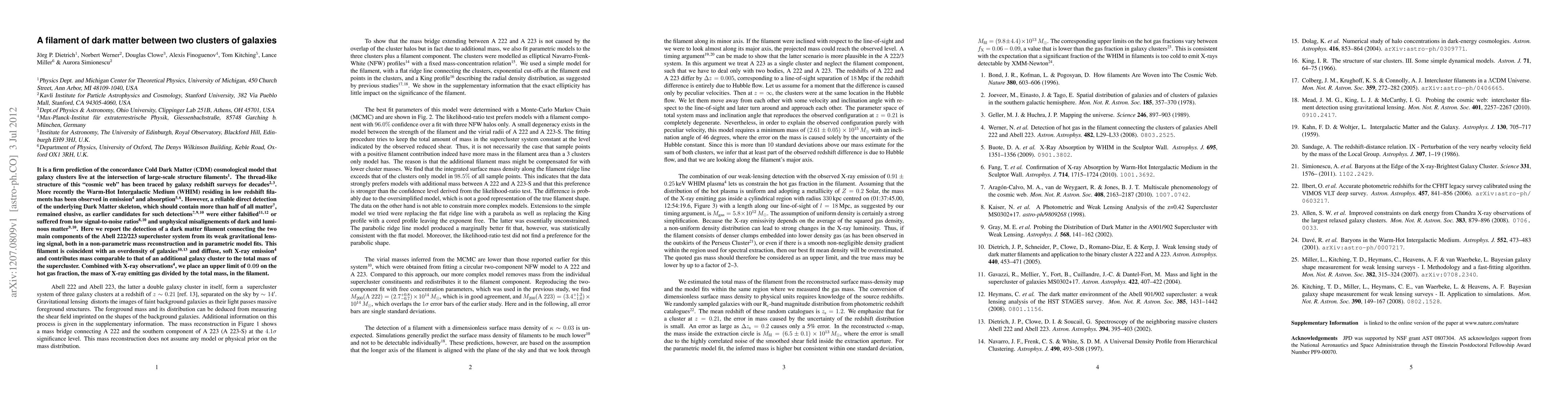 This paper reports the first reliable detection of a dark matter filament linking two galaxy clusters in the Abell 222/223 supercluster, identified through weak gravitational lensing. The filament coincides with an overdensity of galaxies and soft X-ray emission, and contributes significant mass to the supercluster.