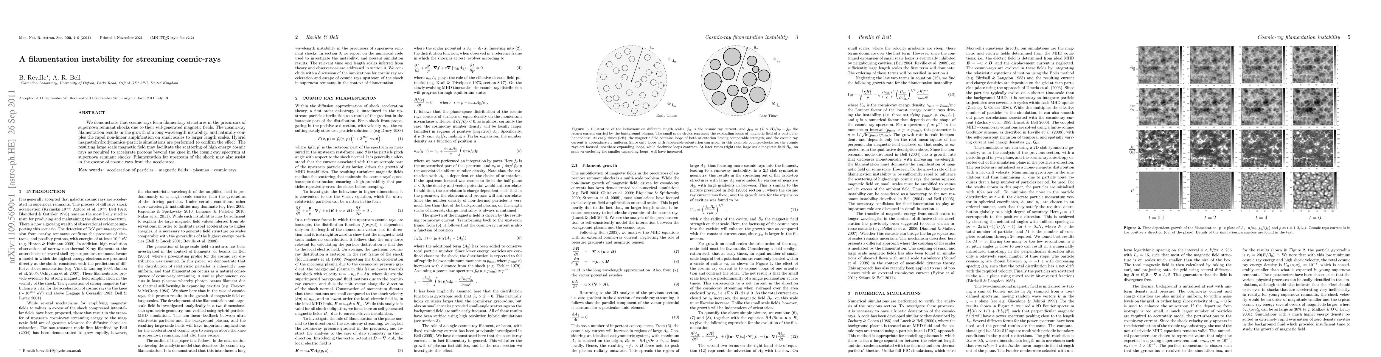This paper demonstrates that cosmic rays create filamentary structures in supernova remnant shock precursors due to their self-generated magnetic fields, leading to a long-wavelength instability. Simulations confirm this filamentation and suggest it may accelerate protons beyond the knee in the cosmic-ray spectrum and facilitate cosmic ray escape from the accelerator.