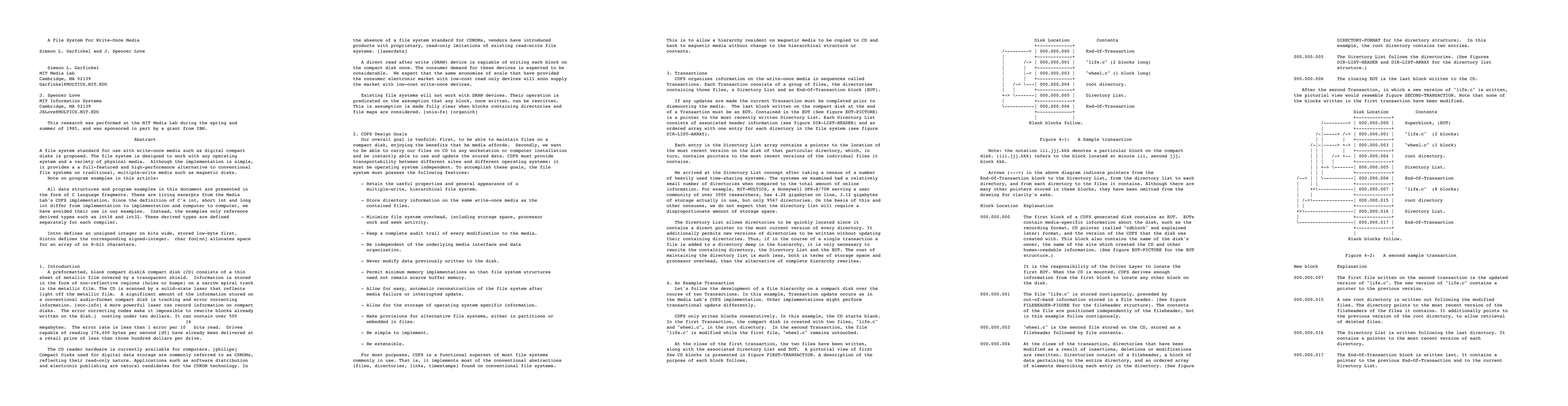 A file system standard for use with write-once media such as digital compact disks is proposed. The file system is designed to work with any operating system and a variety of physical media. Although the implementation is simple, it provides a a full-featured and high-performance alternative to conventional file systems on traditional, multiple-write media such as magnetic disks.