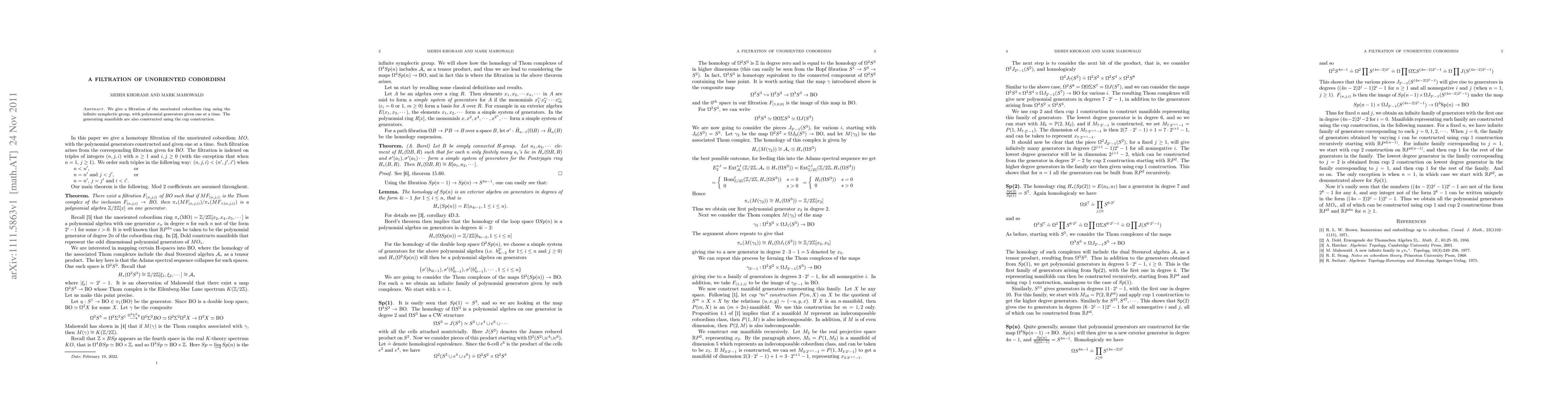 We give a filtration of the unoriented cobordism ring using the infinite symplectic group, with polynomial generators given one at a time. The generating manifolds are also constructed using the cup construction.
