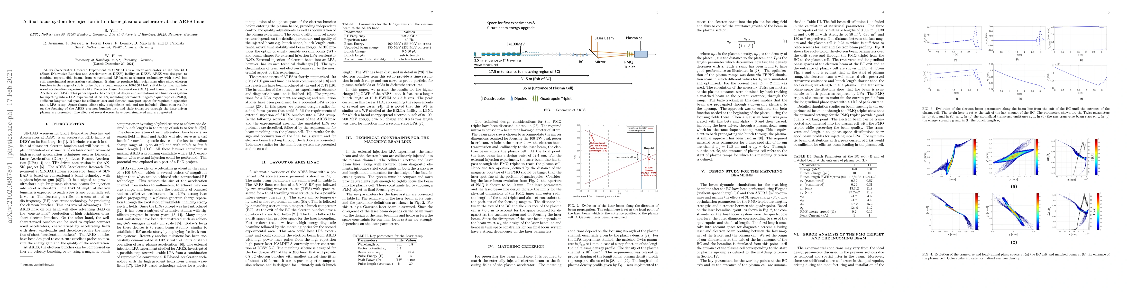 ARES (Accelerator Research Experiment at SINBAD) is a linear accelerator at the SINBAD (Short INnovative Bunches and Accelerators at DESY) facility at DESY. ARES was designed to combine reproducible beams from conventional RF-based accelerator technology with novel but still experimental acceleration techniques. It aims to produce high brightness ultra-short electron bunches in the range of sub fs to few fs, at a beam energy of 100-150 MeV, suitable for injection into novel acceleration experiments like Dielectric Laser Acceleration (DLA) and Laser driven Plasma Acceleration (LPA). This paper reports the conceptual design and simulations of a final focus system for injecting into a LPA experiment at ARES, including permanent magnetic quadrupoles (PMQ), sufficient longitudinal space for collinear laser and electron transport, space for required diagnostics and a LPA setup. Space-charge effects play a significant role and are included. Simulation results on the focusing of the ARES electron bunches into and their transport through the laser-driven plasma are presented. The effects of several errors have been simulated and are reported.