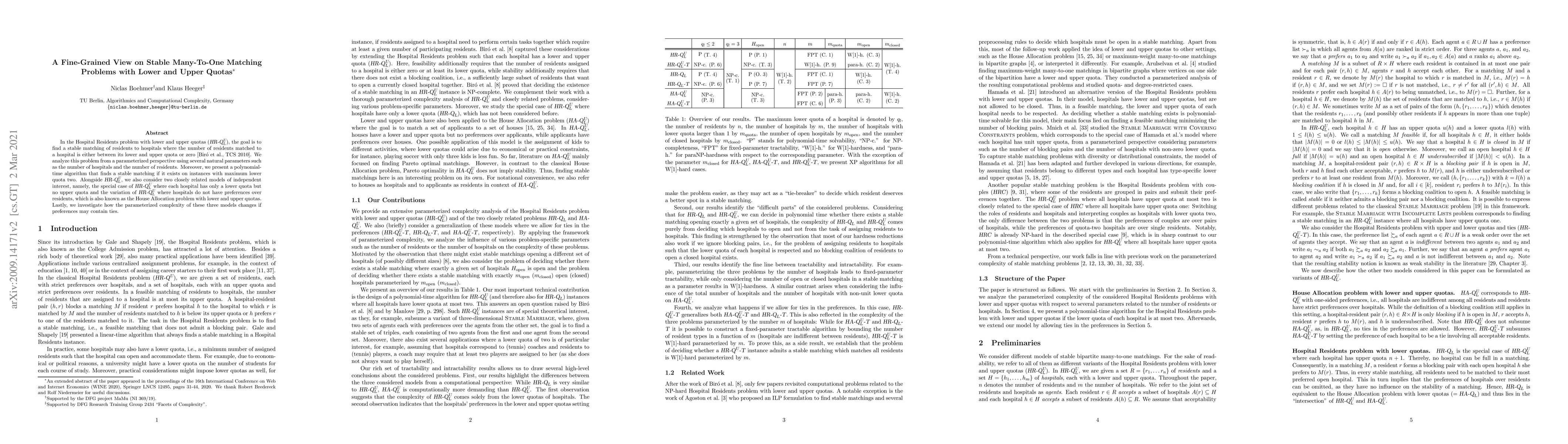 In the Hospital Residents problem with lower and upper quotas ($HR-Q^U_L$), the goal is to find a stable matching of residents to hospitals where the number of residents matched to a hospital is either between its lower and upper quota or zero [Bir\'o et al., TCS 2010]. We analyze this problem from a parameterized perspective using several natural parameters such as the number of hospitals and the number of residents. Moreover, we present a polynomial-time algorithm that finds a stable matching if it exists on instances with maximum lower quota two. Alongside $HR-Q^U_L$, we also consider two closely related models of independent interest, namely, the special case of $HR-Q^U_L$ where each hospital has only a lower quota but no upper quota and the variation of $HR-Q^U_L$ where hospitals do not have preferences over residents, which is also known as the House Allocation problem with lower and upper quotas. Lastly, we investigate how the parameterized complexity of these three models changes if preferences may contain ties.