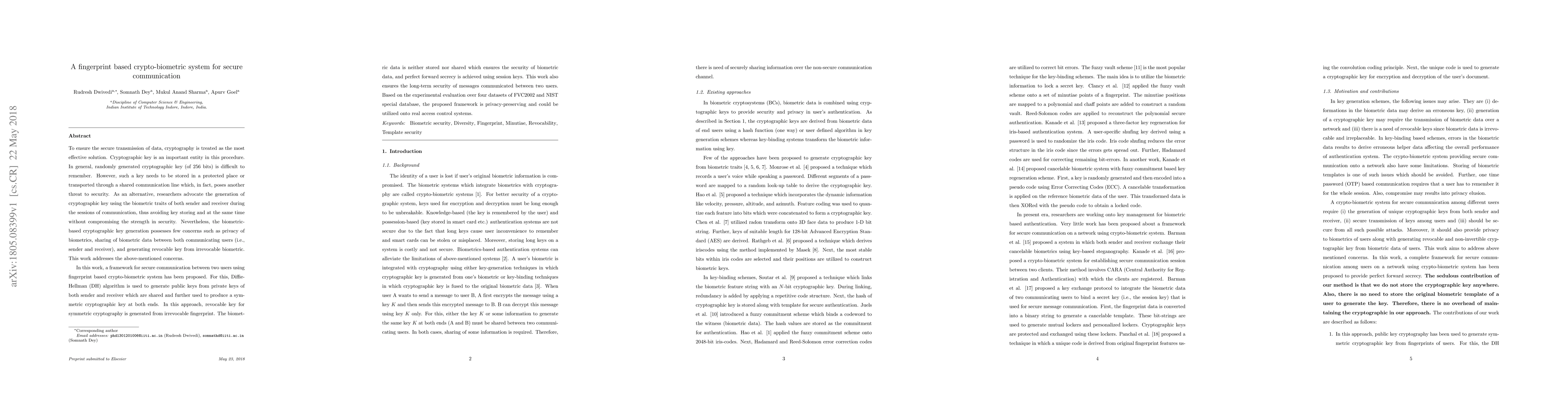 This paper proposes a secure communication framework using a fingerprint-based crypto-biometric system that generates cryptographic keys from biometric traits to avoid key storage threats. The Diffie-Hellman algorithm is used to create public keys from private keys, ensuring biometric data privacy and perfect forward secrecy.
