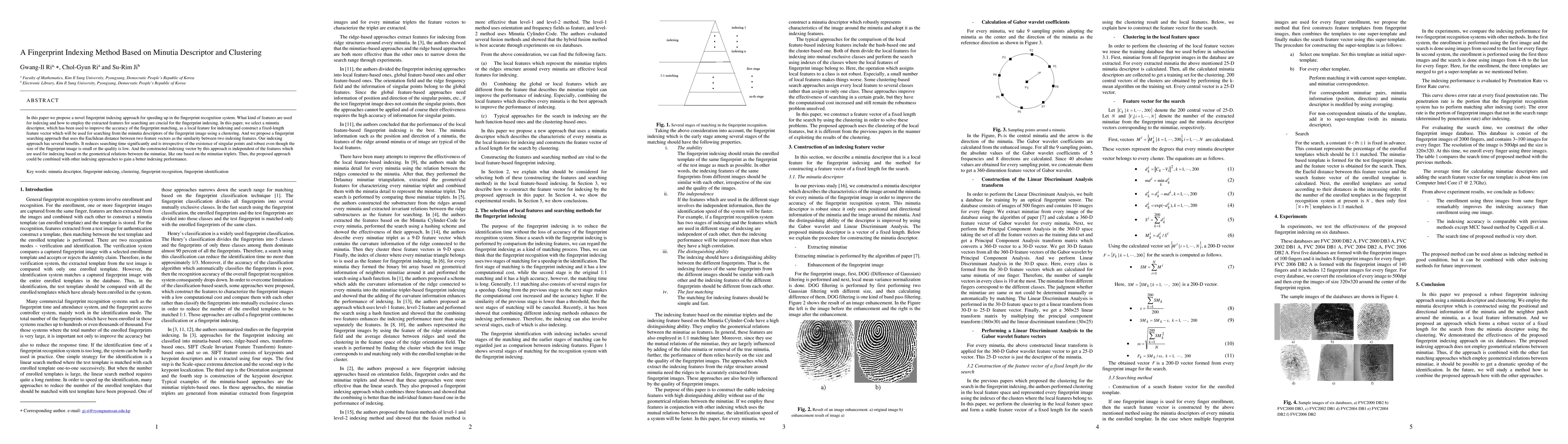 A new fingerprint indexing method uses minutia descriptors for local features and clustering to speed up recognition systems. This approach reduces searching time, is robust even in low-quality images, and can be combined with other methods for better performance.