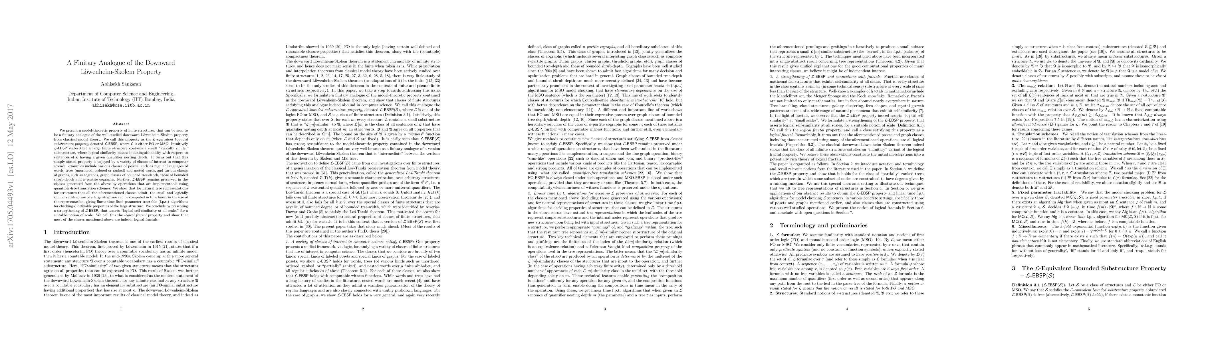We present a model-theoretic property of finite structures, that can be seen to be a finitary analogue of the well-studied downward L\"owenheim-Skolem property from classical model theory. We call this property as the *$\mathcal{L}$-equivalent bounded substructure property*, denoted $\mathcal{L}$-$\mathsf{EBSP}$, where $\mathcal{L}$ is either FO or MSO. Intuitively $\mathcal{L}$-$\mathsf{EBSP}$ states that a large finite structure contains a small "logically similar" substructure, where logical similarity means indistinguishability with respect to sentences of $\mathcal{L}$ having a given quantifier nesting depth. It turns out that this simply stated property is enjoyed by a variety of classes of interest in computer science: examples include various classes of posets, such as regular languages of words, trees (unordered, ordered or ranked) and nested words, and various classes of graphs, such as cographs, graph classes of bounded tree-depth, those of bounded shrub-depth and $n$-partite cographs. Further, $\mathcal{L}$-$\mathsf{EBSP}$ remains preserved in the classes generated from the above by operations that are implementable using quantifier-free translation schemes. We show that for natural tree representations for structures that all the aforementioned classes admit, the small and logically similar substructure of a large structure can be computed in time linear in the size of the representation, giving linear time fixed parameter tractable (f.p.t.) algorithms for checking $\mathcal{L}$ definable properties of the large structure. We conclude by presenting a strengthening of $\mathcal{L}$-$\mathsf{EBSP}$, that asserts "logical self-similarity at all scales" for a suitable notion of scale. We call this the *logical fractal* property and show that most of the classes mentioned above are indeed, logical fractals.