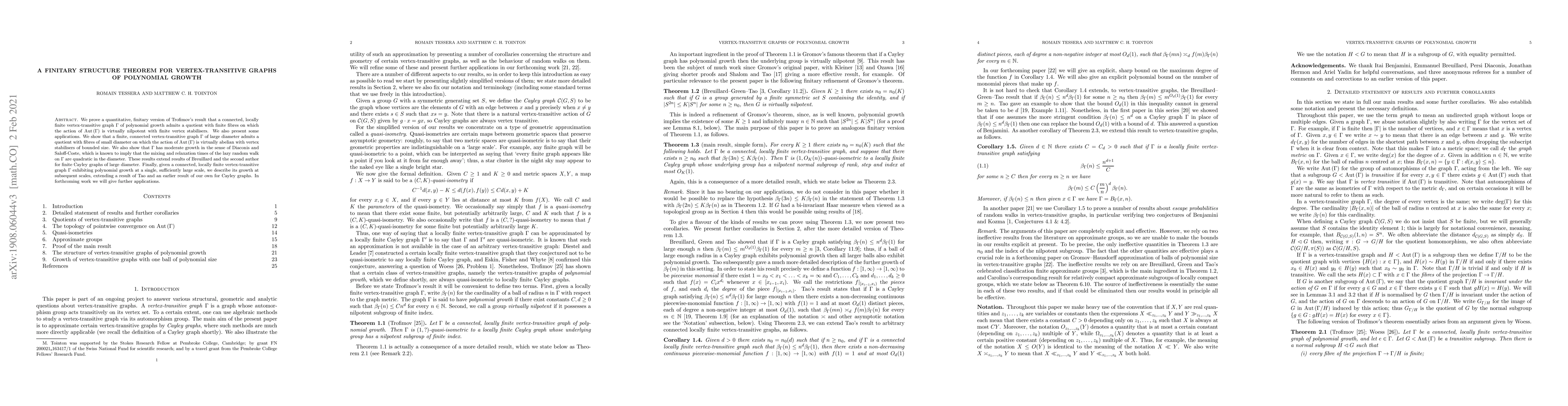 Researchers prove that a connected, vertex-transitive graph of polynomial growth can be quotiented to have a virtually nilpotent group action with finite fibre size, and apply this result to graphs of large diameter.