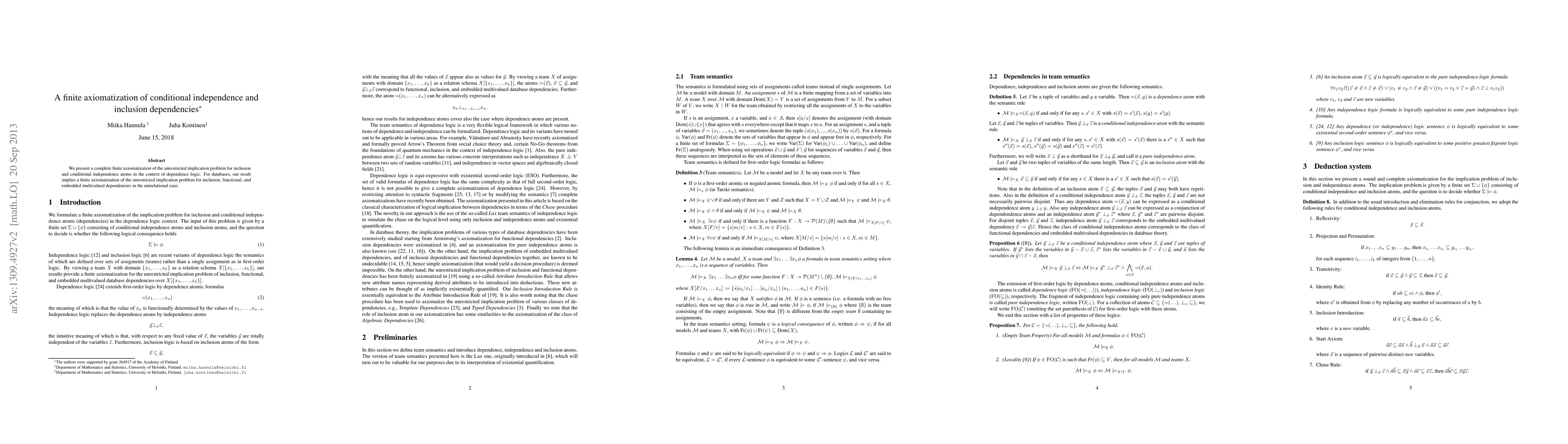 This paper provides a complete finite axiomatization for the implication problem involving inclusion and conditional independence in dependence logic. It also extends the result to databases, offering a finite axiomatization for inclusion, functional, and embedded multivalued dependencies in unirelational cases.