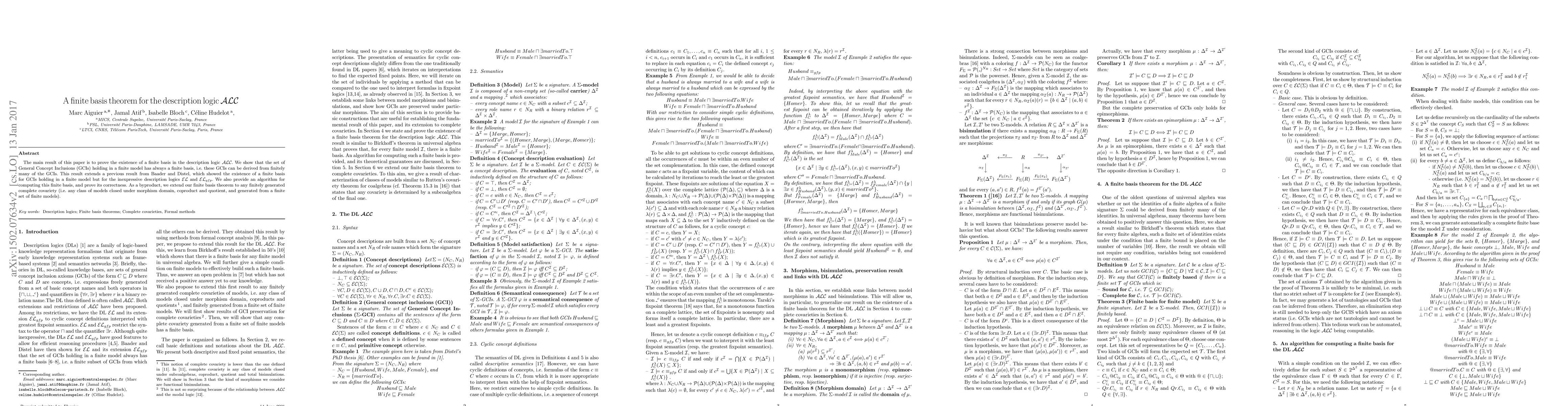 The main result of this paper is to prove the existence of a finite basis in the description logic ${\cal ALC}$. We show that the set of General Concept Inclusions (GCIs) holding in a finite model has always a finite basis, i.e. these GCIs can be derived from finitely many of the GCIs. This result extends a previous result from Baader and Distel, which showed the existence of a finite basis for GCIs holding in a finite model but for the inexpressive description logics ${\cal EL}$ and ${\cal EL}_{gfp}$. We also provide an algorithm for computing this finite basis, and prove its correctness. As a byproduct, we extend our finite basis theorem to any finitely generated complete covariety (i.e. any class of models closed under morphism domain, coproduct and quotient, and generated from a finite set of finite models).