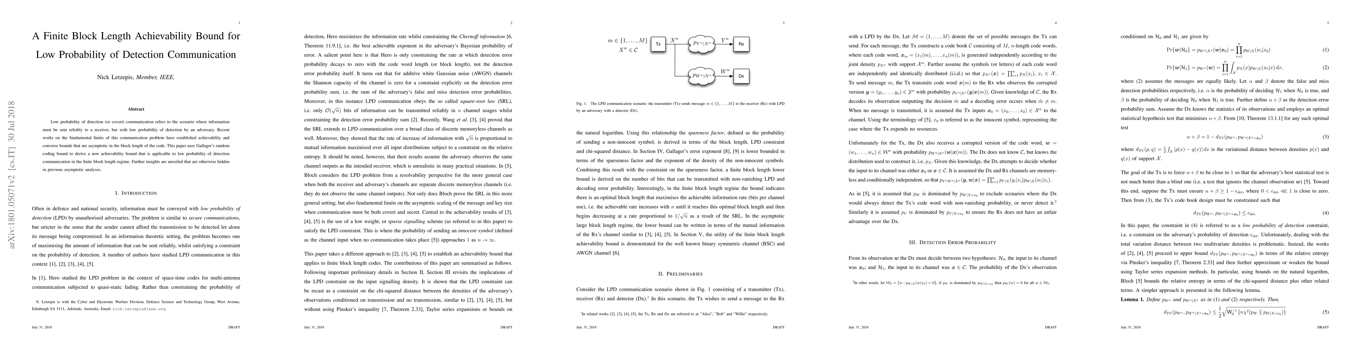 This paper derives a finite block length achievability bound for low probability of detection communication using Gallager's random coding bound, providing new insights beyond traditional asymptotic analyses.