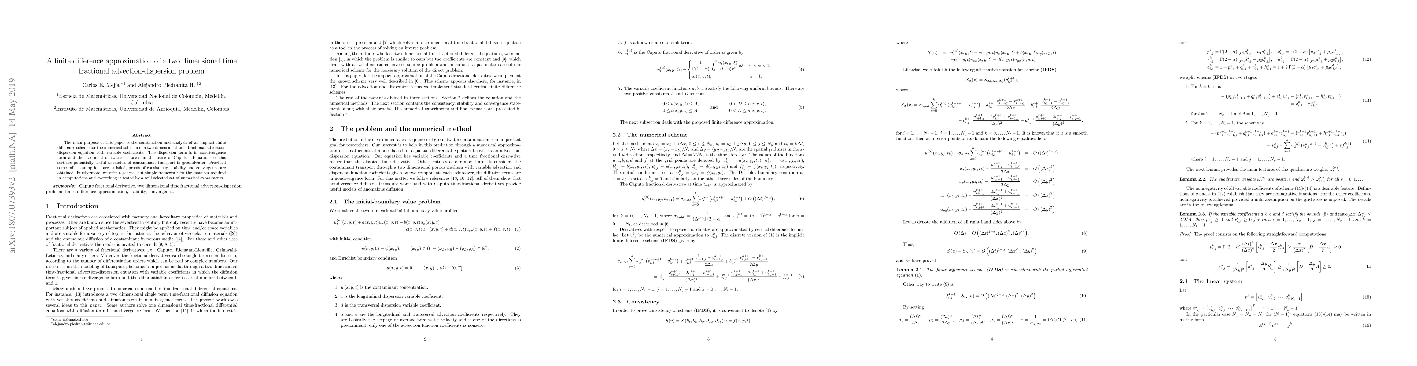 This paper develops an implicit finite difference method to solve a two-dimensional time fractional advection-dispersion equation with variable coefficients. The method's consistency, stability, and convergence are rigorously proven, and numerical experiments demonstrate the approximation's quality.