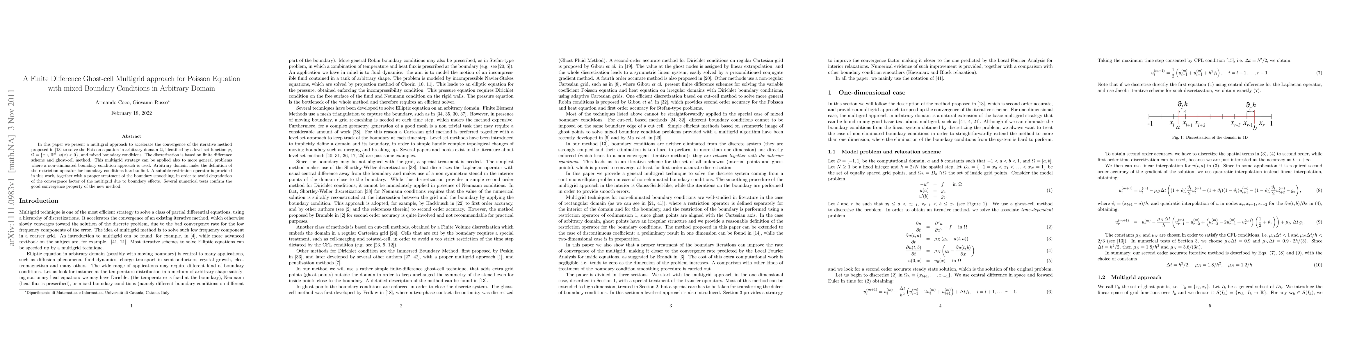 This paper introduces a finite difference ghost-cell multigrid method for solving the Poisson equation in arbitrary domains with mixed boundary conditions. The method provides a suitable restriction operator and boundary smoothing to maintain convergence efficiency, validated by numerical tests.
