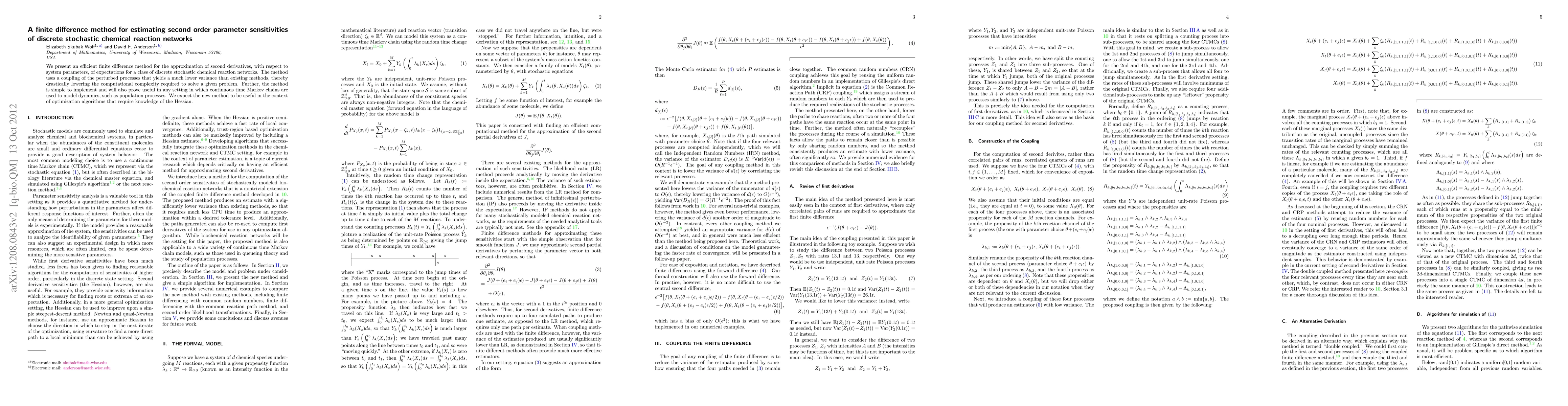 This paper introduces a finite difference method for estimating second-order parameter sensitivities in discrete stochastic chemical reaction networks, achieving lower variance and computational complexity compared to existing methods. The method is simple to implement and applicable to continuous time Markov chains, useful for optimization algorithms requiring Hessian knowledge.