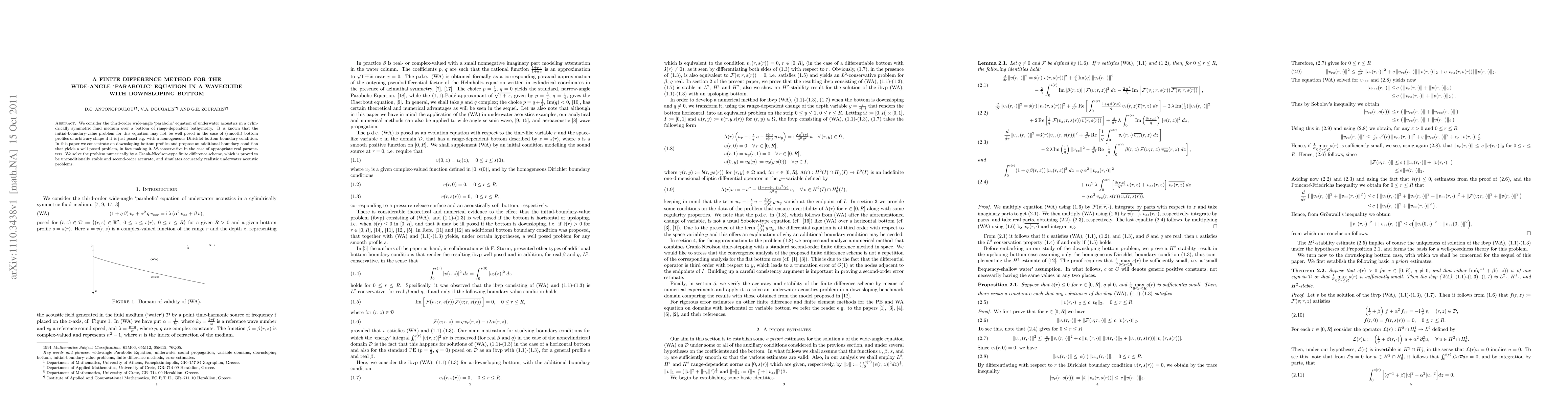 We consider the third-order wide-angle `parabolic' equation of underwater acoustics in a cylindrically symmetric fluid medium over a bottom of range-dependent bathymetry. It is known that the initial-boundary-value problem for this equation may not be well posed in the case of (smooth) bottom profiles of arbitrary shape if it is just posed e.g. with a homogeneous Dirichlet bottom boundary condition. In this paper we concentrate on downsloping bottom profiles and propose an additional boundary condition that yields a well posed problem, in fact making it $L^2$-conservative in the case of appropriate real parameters. We solve the problem numerically by a Crank-Nicolson-type finite difference scheme, which is proved to be unconditionally stable and second-order accurate, and simulates accurately realistic underwater acoustic problems.
