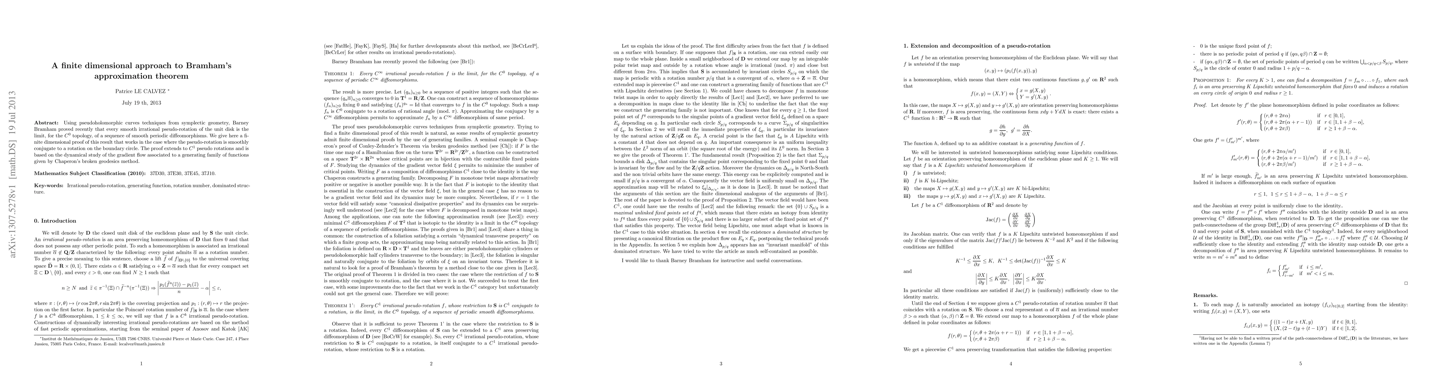 Using pseudoholomorphic curves techniques from symplectic geometry, Barney Bramham proved recently that every smooth irrational pseudo-rotation of the unit disk is the limit, for the $C^0$ topology, of a sequence of smooth periodic diffeomorphisms. We give here a finite dimensional proof of this result that works in the case where the pseudo-rotation is smoothly conjugate to a rotation on the boundary circle. The proof extends to $C^1$ pseudo rotations and is based on the dynamical study of the gradient flow associated to a generating family of functions given by Chaperon's broken geodesics method.