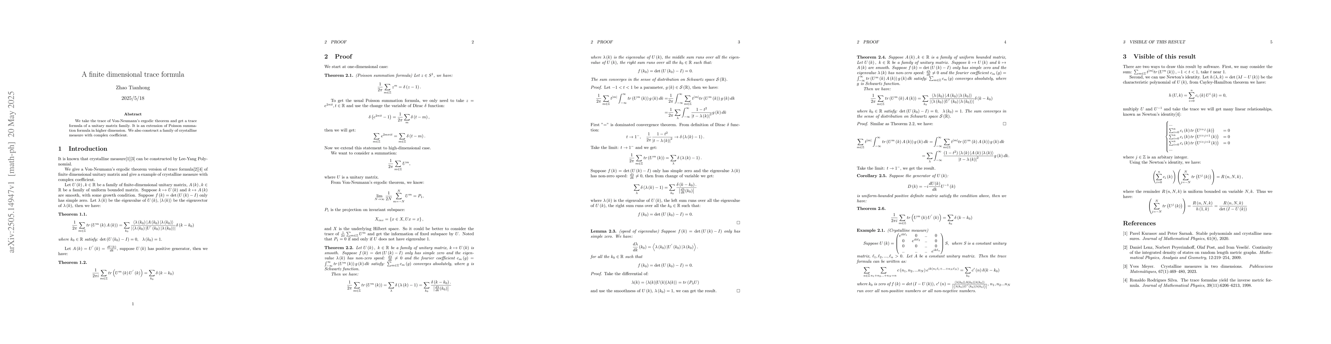 The paper extends the Poisson summation formula using Von-Neumann's ergodic theorem, resulting in a trace formula for unitary matrix families and a construction of a family of crystalline measures with complex coefficients.