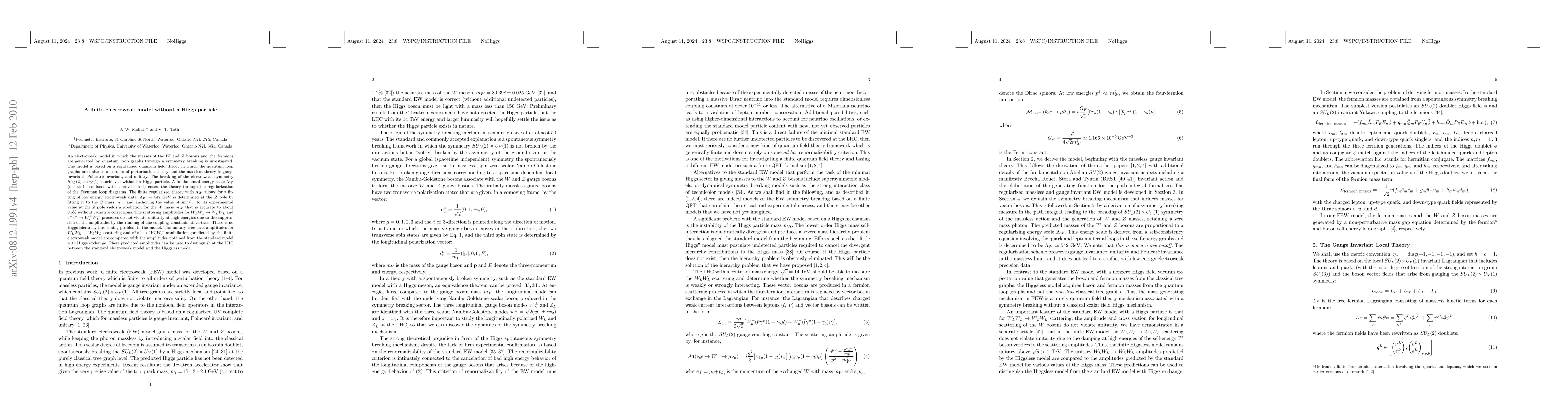 This paper proposes a finite electroweak model generating W and Z boson masses and fermion masses through quantum loop graphs without a Higgs particle. The model's regularization avoids the Higgs hierarchy problem, fits low-energy data accurately, and predicts scattering amplitudes comparable to the standard model, potentially distinguishable at the LHC.
